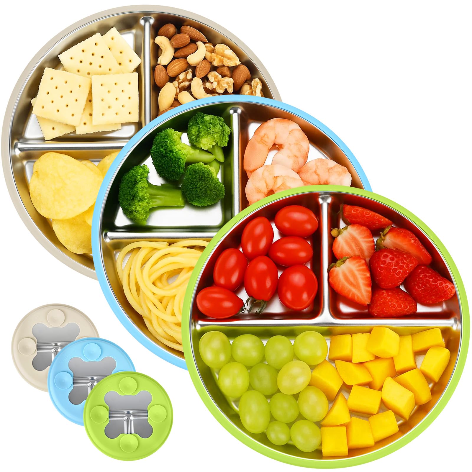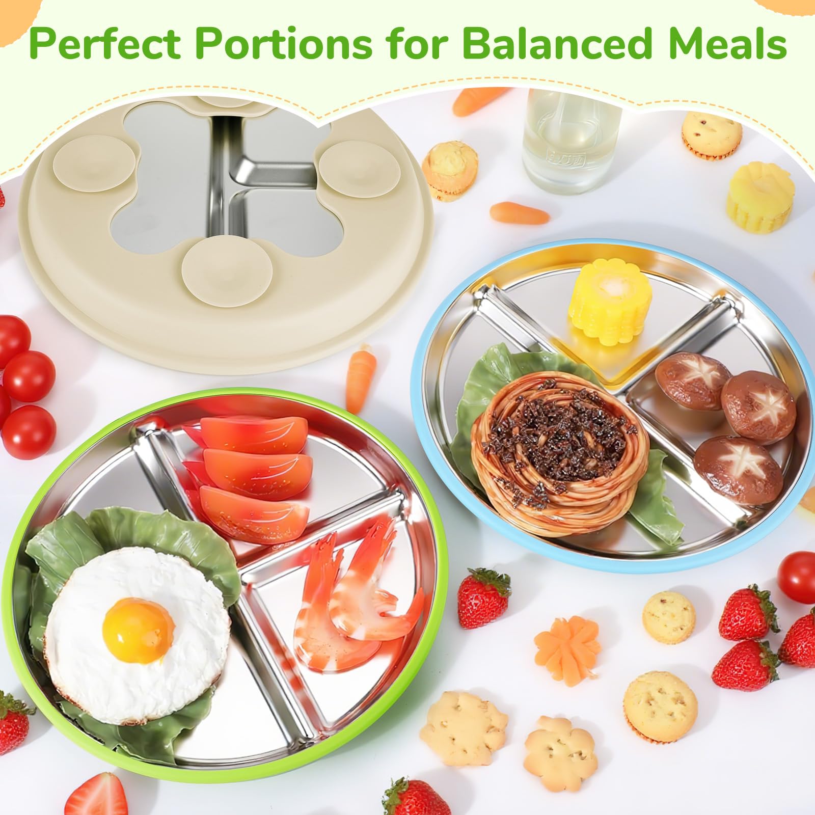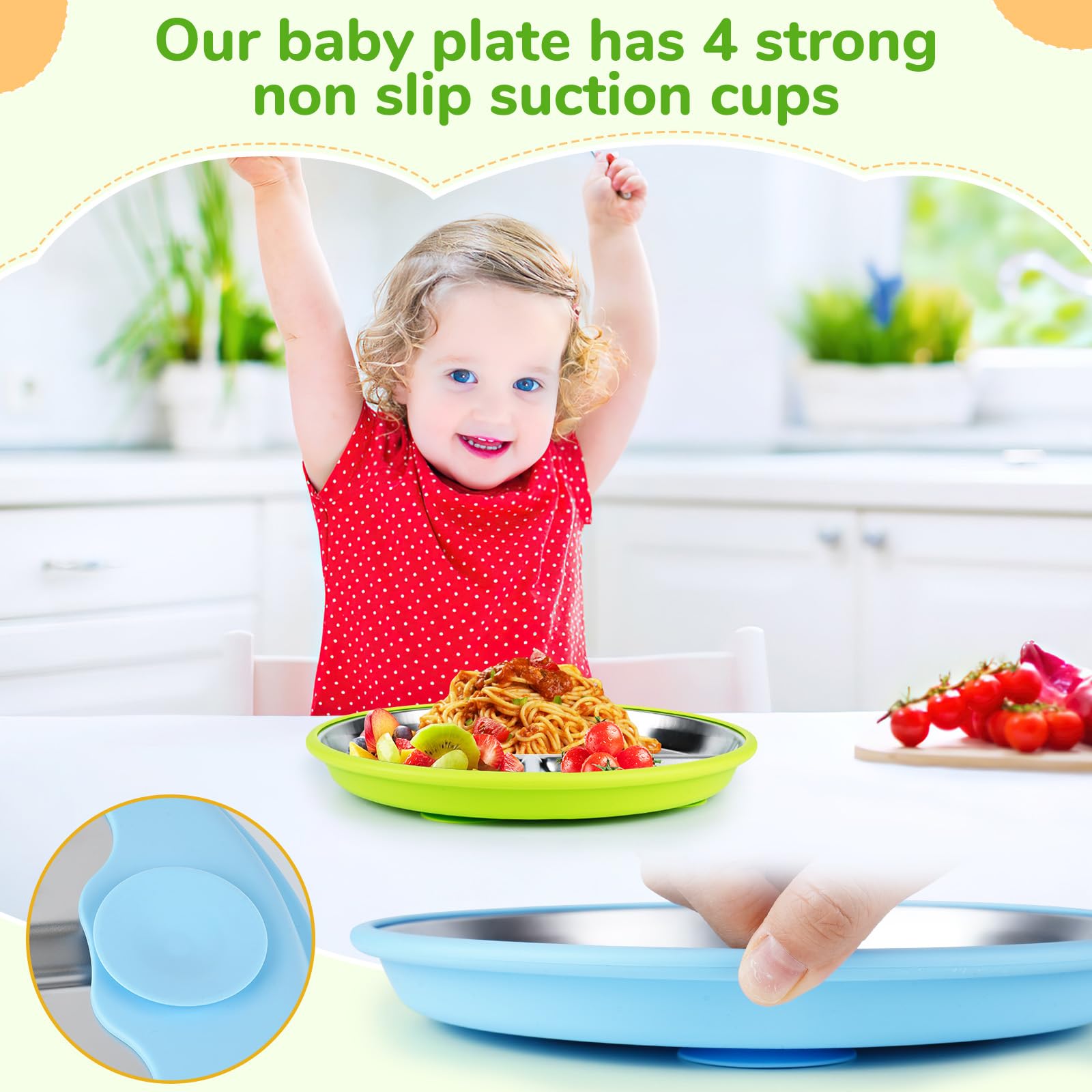 - 304 STAINLESS STEEL This 304 stainless steel baby plate is made of high quality 304 stainless steel material, has a silicone base and is equipped with 3 non-slip suction cups. It sticks firmly to children's high chairs or tables and effectively prevents the baby plate from tipping over, which offers parents more safety, freedom and relaxation