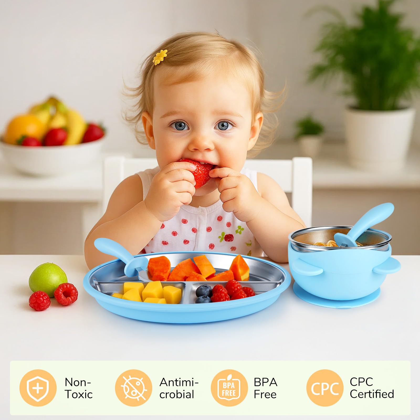 - ERGONOMIC GRIP: Stainless steel plates and ergonomic cutlery set accompany little hands on their learning journey. Rounded edges prevent injury to baby. The suction cup adheres perfectly to smooth surfaces such as highchair trays, glass or polished table tops, but is not suitable for rough wooden surfaces, so this should be avoided.