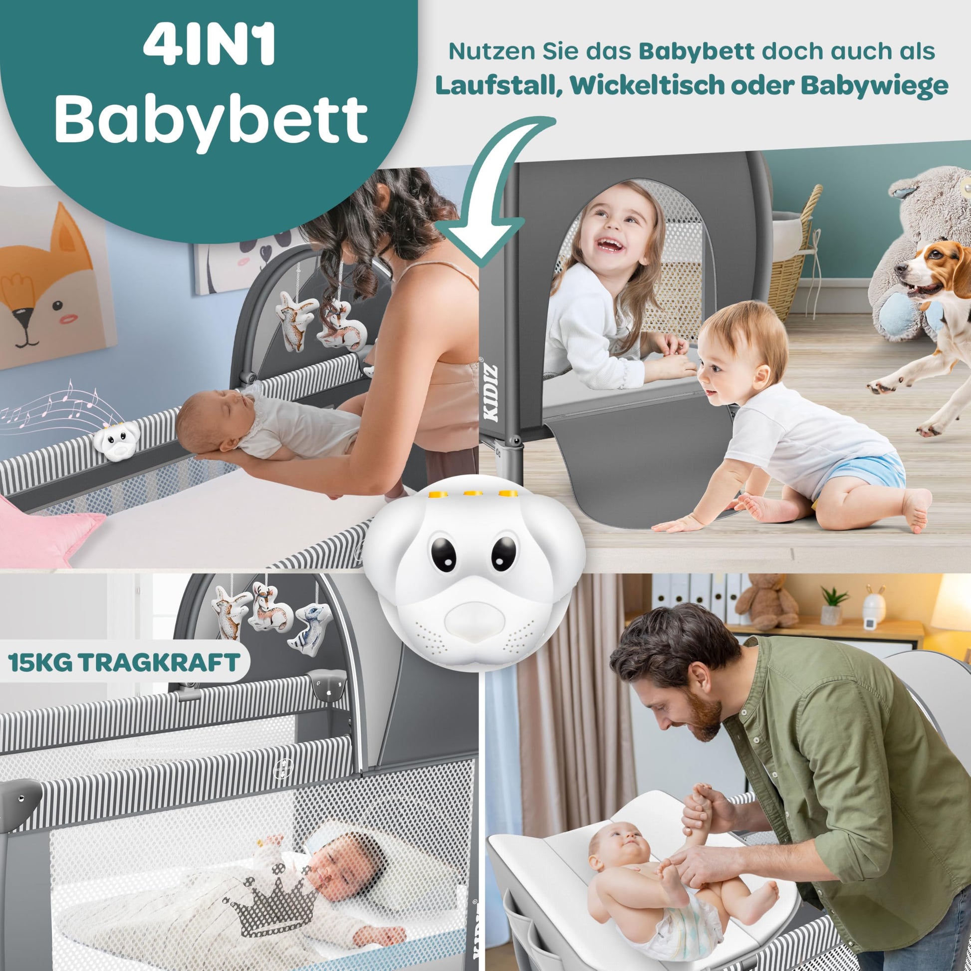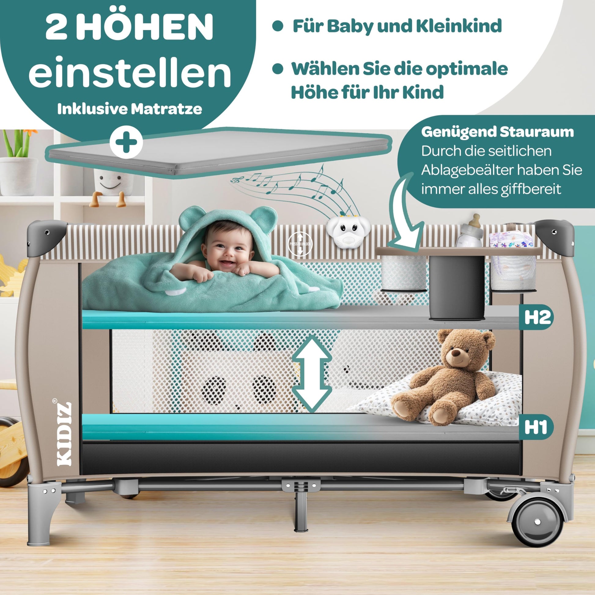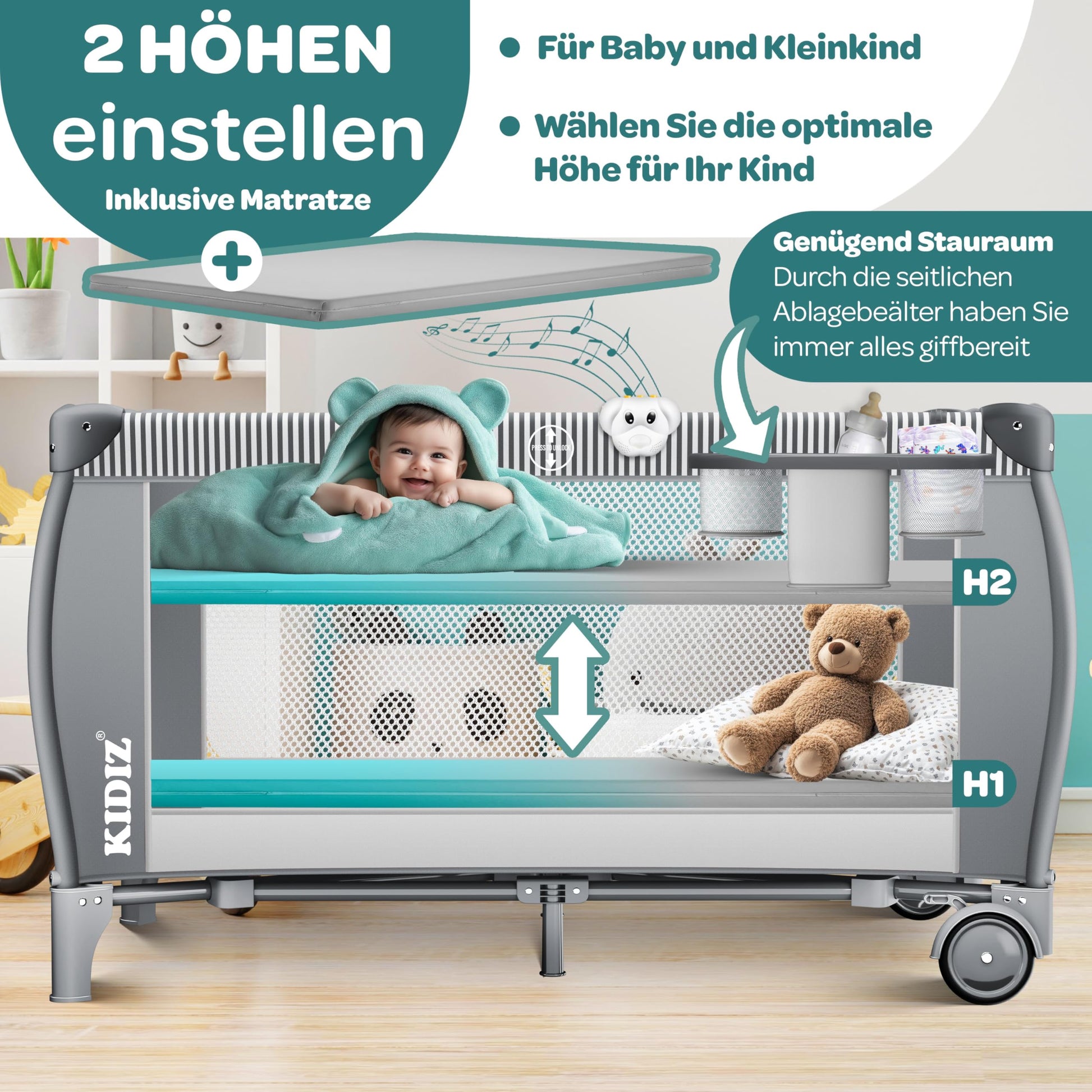 - Easy to clean with only approx. 8 kg, the Kidiz travel cot is particularly light and mobile. It comes with a practical carry bag, changing mat and other accessories - everything you need for flexible use. A matching insert is also included, so you are ready to go. The removable changing mat with easy-care surface provides a clean way to change on the go. The integrated game module with gentle sounds and light vibrations ensures relaxed moments and age-appropriate entertainment.