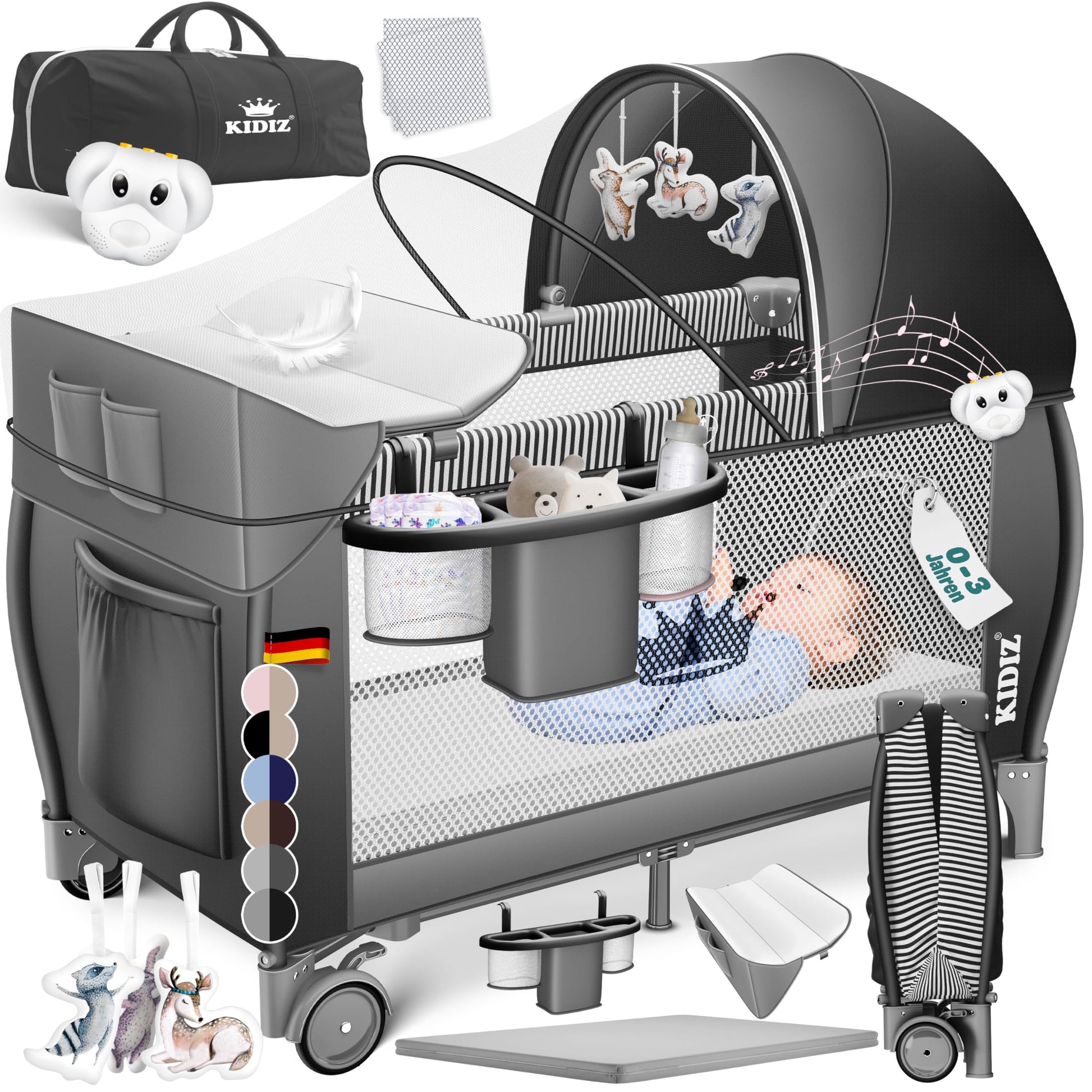 KIDIZ baby bed, travel cot and playpen 3-in-1, lightweight and comfortable to transport thanks to the travel bag, ideal for your children thanks to the integrated changing table and toys with soothing melodies as well as pleasant vibrations for a restful sleep.