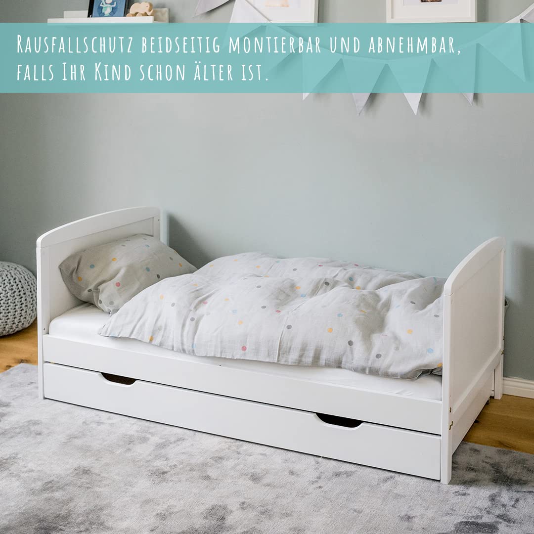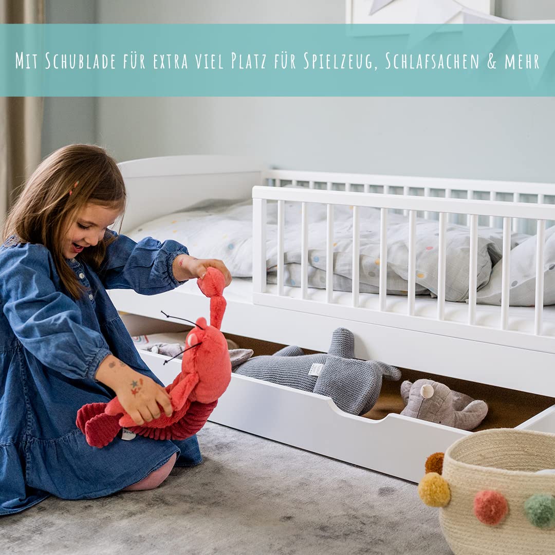 Kinderbett 70x140 cm mit Schublade, Lattenrost und Rausfallschutz in weiß, mit Bettkasten