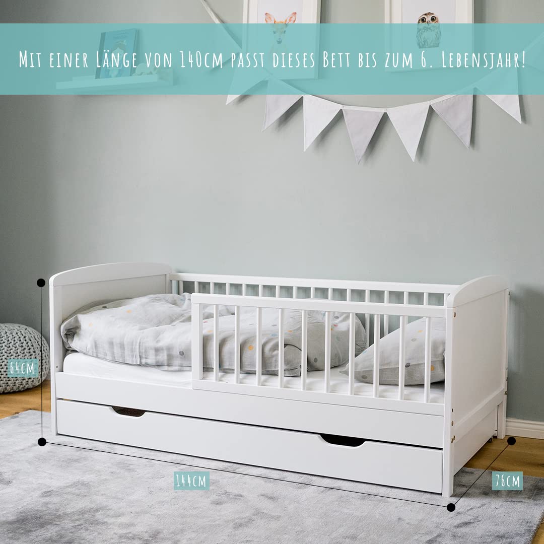 - FÜR 2 BIS 6 JÄHRIGE: Perfekt geeignet als Übergangsbett nach dem Babybett, und vor den 90x200cm Riesenbetten für unsere Kids. Empfohlen bis Körpergröße 110cm, entspricht einem Alter von 5 bis 6 Jahren. (Außenmaße: 144,2 x 75,7 x 64 cm)