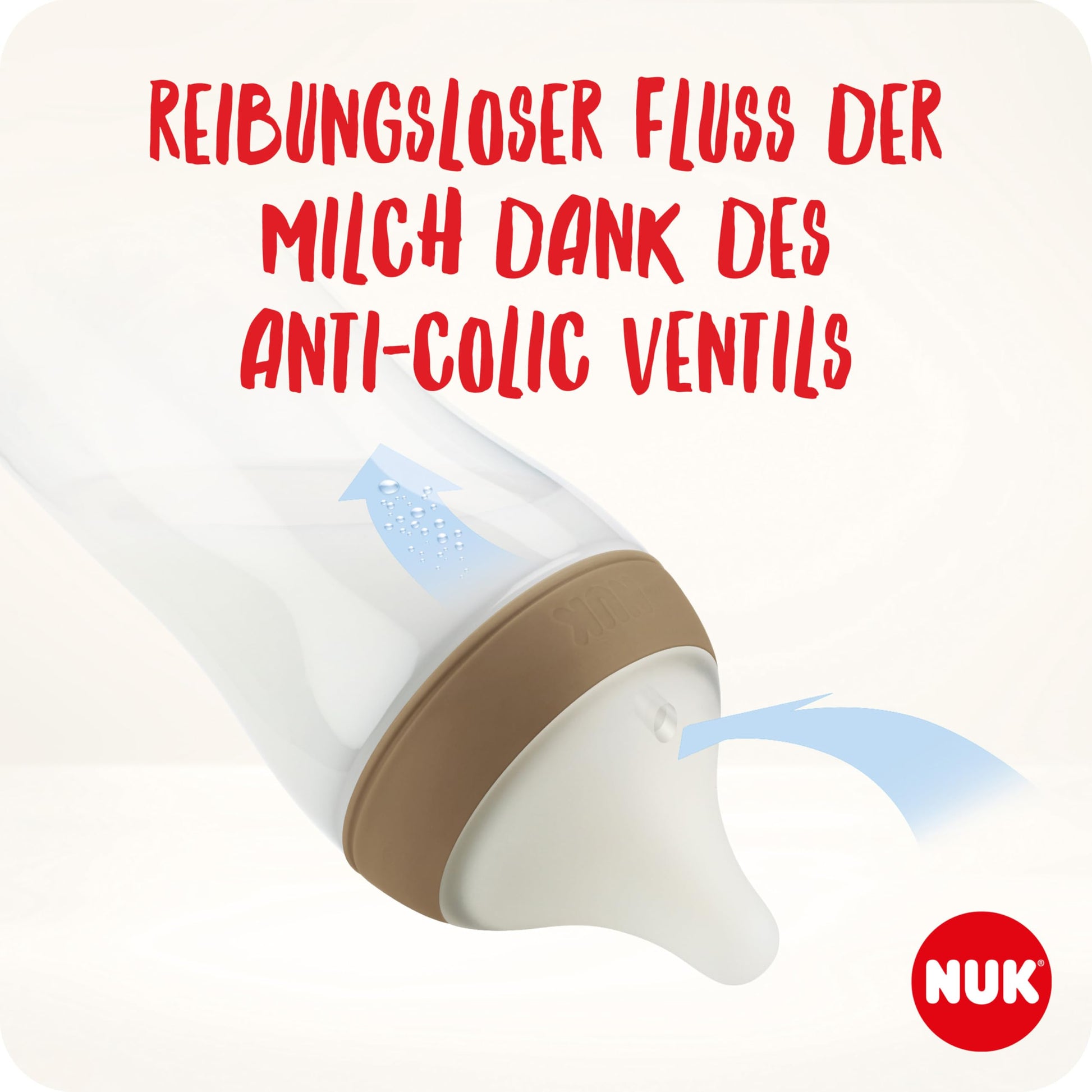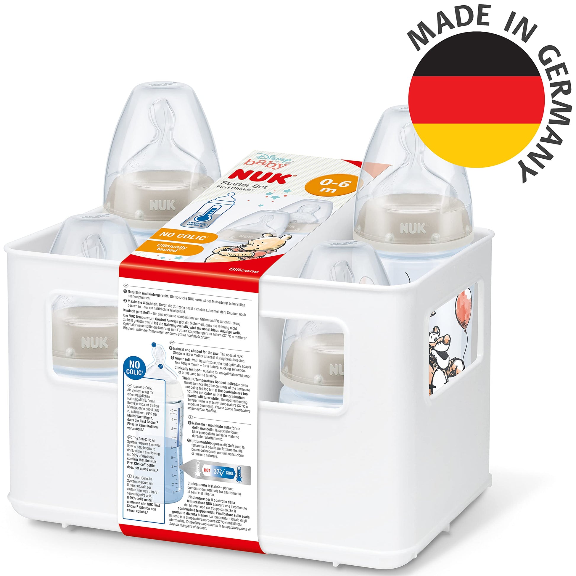 The NUK starter set with four baby bottles and a bottle box offers everything your baby needs at the beginning. The First Choice+ baby bottles have an orthodontic teat and a soft zone, which is modelled on the mother's breast when breastfeeding. Babies take the teat easier and mothers can switch between breastfeeding and bottle feeding. The integrated temperature control indicator changes from blue to white when the bottle contents are too hot, so you can be sure that your baby's milk always has the right drinking temperature. The NUK Anti-Colic Air System prevents colic caused by swallowing air. The bottles are also BPA-free and durable. The starter set also includes a practical bottle box for up to 6 NUK First Choice+ bottles, ideal for travel or storage.