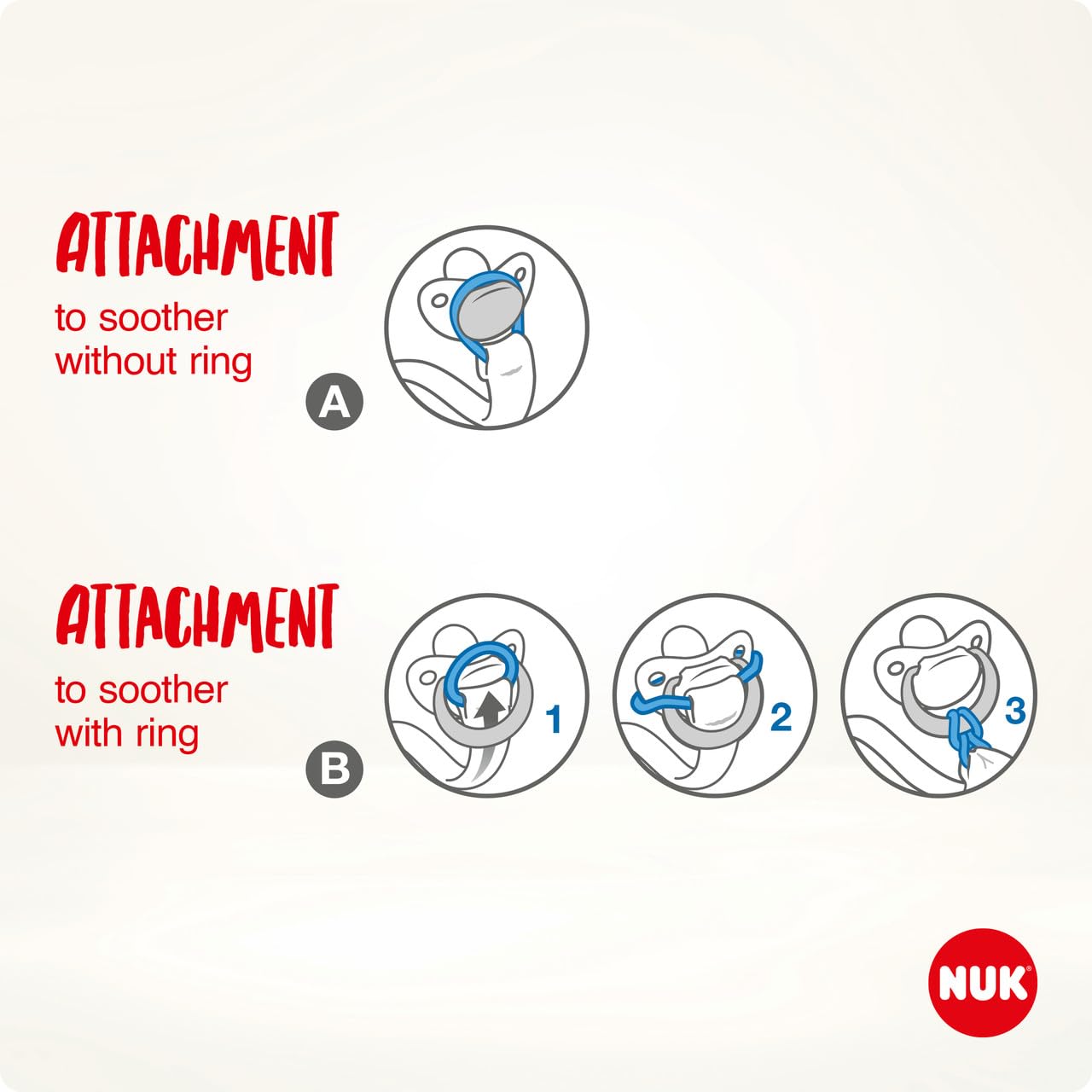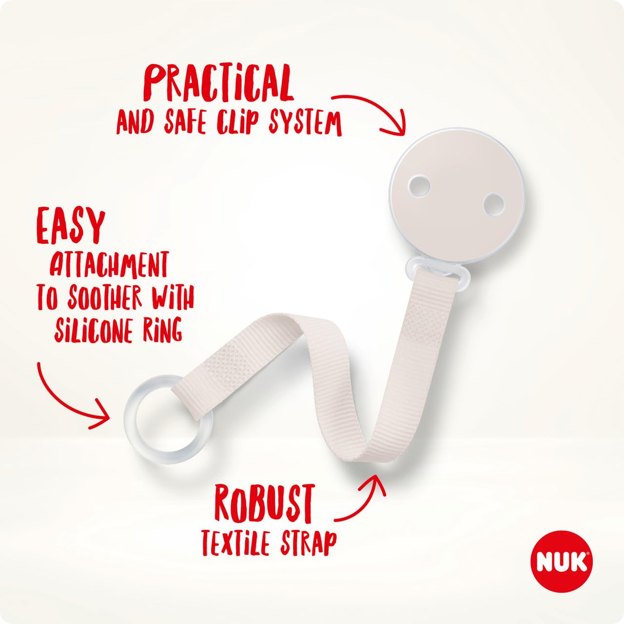 Sorgen Sie mit dem NUK Schnullerband dafür, dass der Lieblingsschnuller Ihres Schatzes jederzeit zur Hand ist. Dank des praktischen Clips, der sich sicher an der Kleidung des Kindes befestigen lässt, müssen Sie sich nie wieder Gedanken über verlorene Schnuller machen. Der flexible Silikonring lässt sich leicht an jedem Schnuller anbringen, der Clip ist aus robustem, bruchsicherem Tritan und PE und das Textilband aus strapazierfähigem Material. Erhältlich in einer Reihe von niedlichen und farbenfrohen Designs, die zur Persönlichkeit Ihres kleinen Lieblings passen.