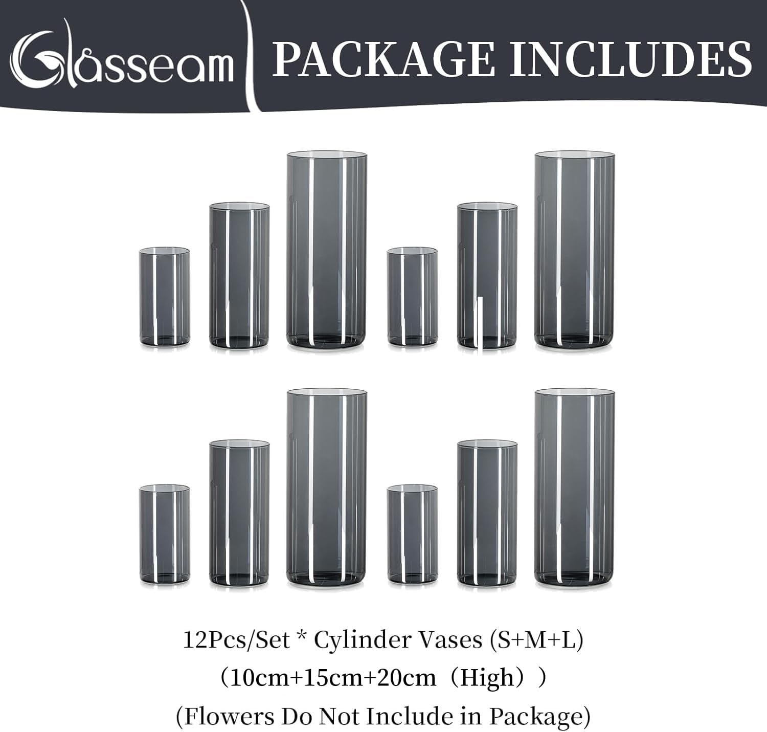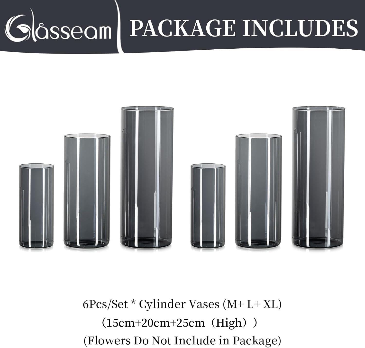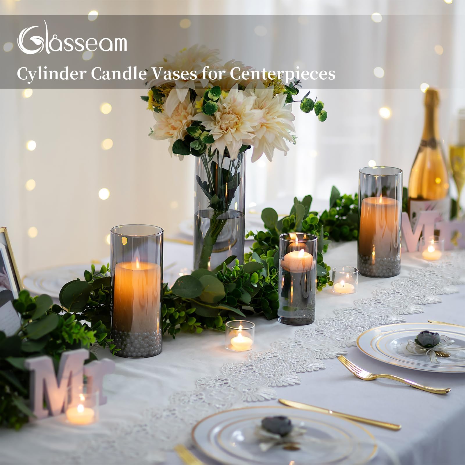 Glasseam Glass Vase Cylinder Vase Grey: Set of 3 Glass Vases Set for Living Room Decorative Glass Cylinder Lantern - Round Flower Vase Modern Glass Vases for Table Decoration Tulips Pampas Grass
