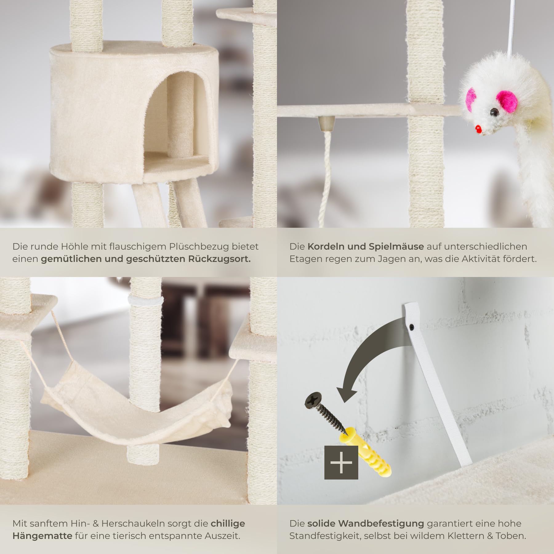 - MIT KATZENHÖHLE, KATZENHÄNGEMATTE, LIEGEPLATZ, KRATZMÖGLICHKEITEN UND KATZENLEITER : Neben einem gemütlichen Katzenkorb bieten unsere Kratzbäume weiteres Katzenzubehör, etwa 2x weiche Katzenliege und eine Hängematte, die perfekt zum Entspannen sind. Deine Katze wird es lieben, sich hier zurückzuziehen und den Tag zu genießen. Komfort und Gemütlichkeit sind garantiert und der Katzenschlafplatz integriert.