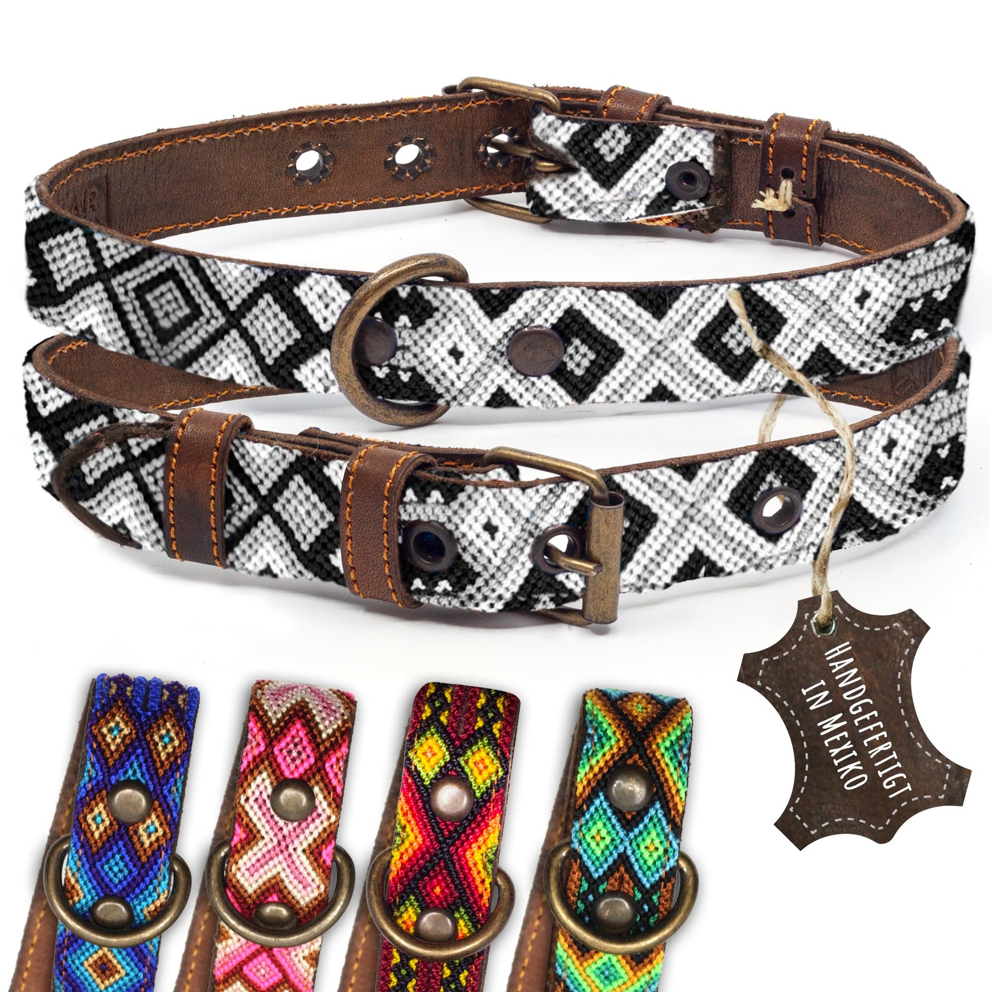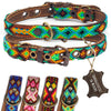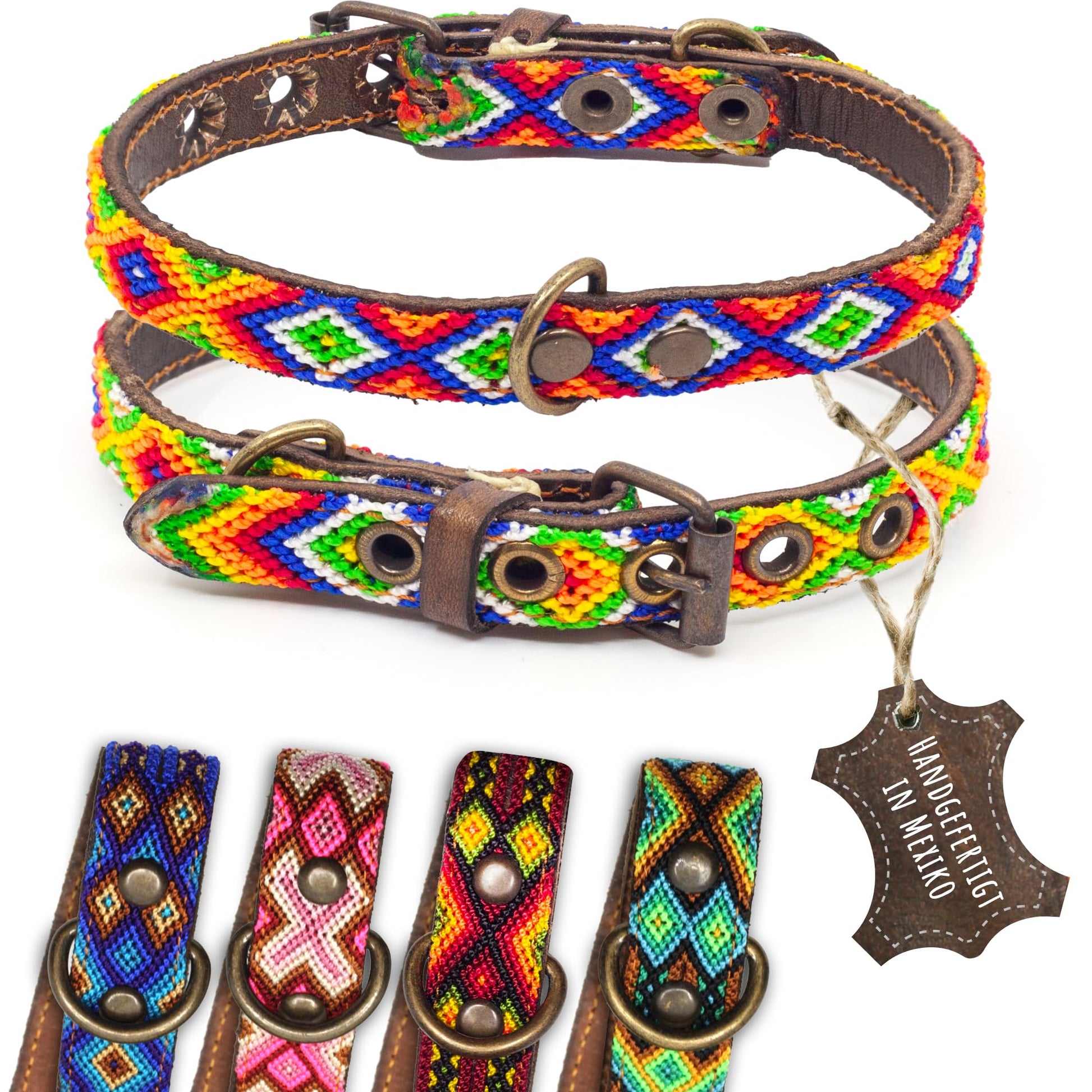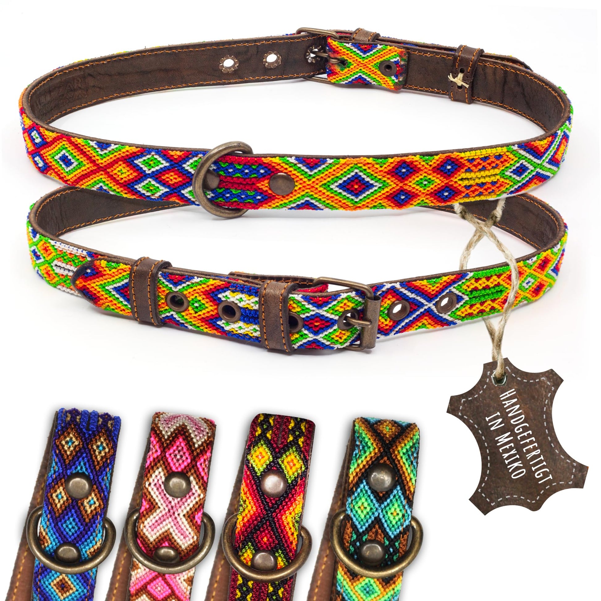 - Dog🐶 KOMFORTABLES ECHTLEDER: Dieses spezielle Material macht das Halsband sehr leicht. Die Oberfläche auf der Außenseite ziert das handgemachte, grün, ocker, blau, braune Maya Muster. Auf der Innenseite naturbelassen weich, bietet das Halsband fellschonenden Tragekomfort.