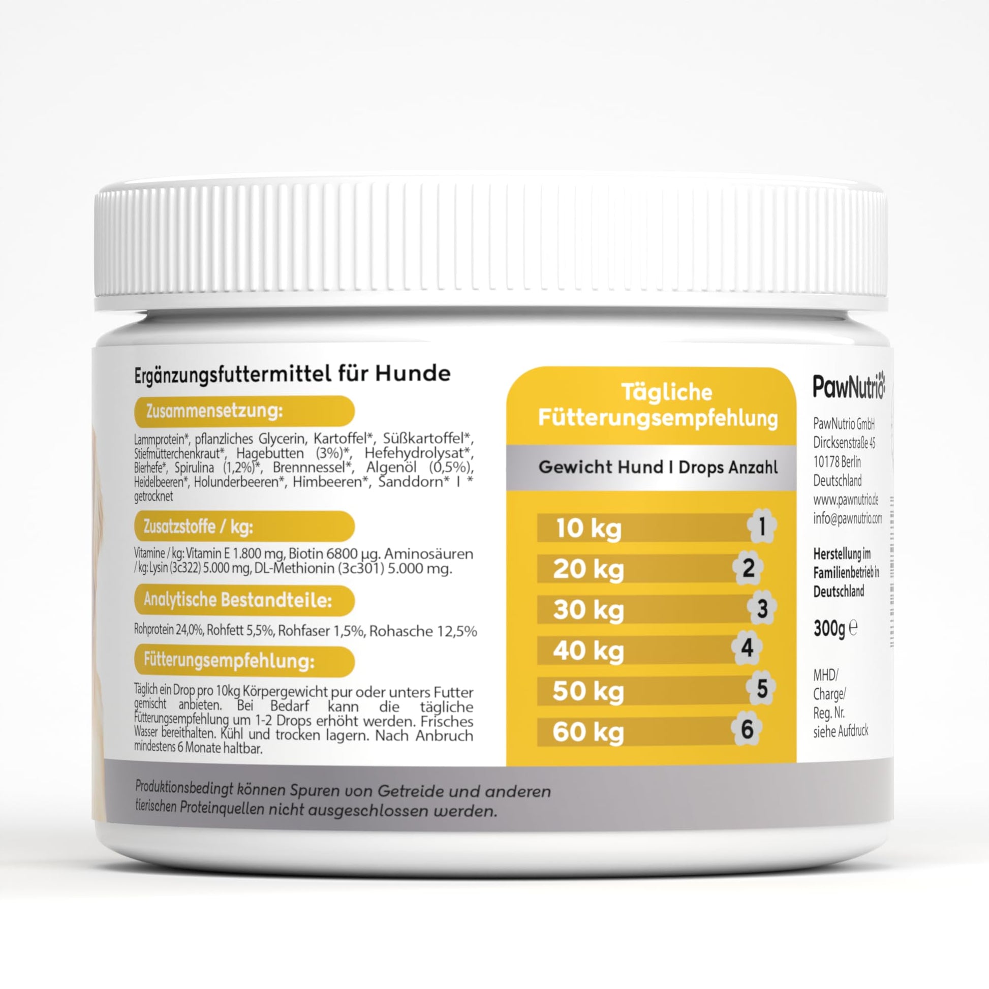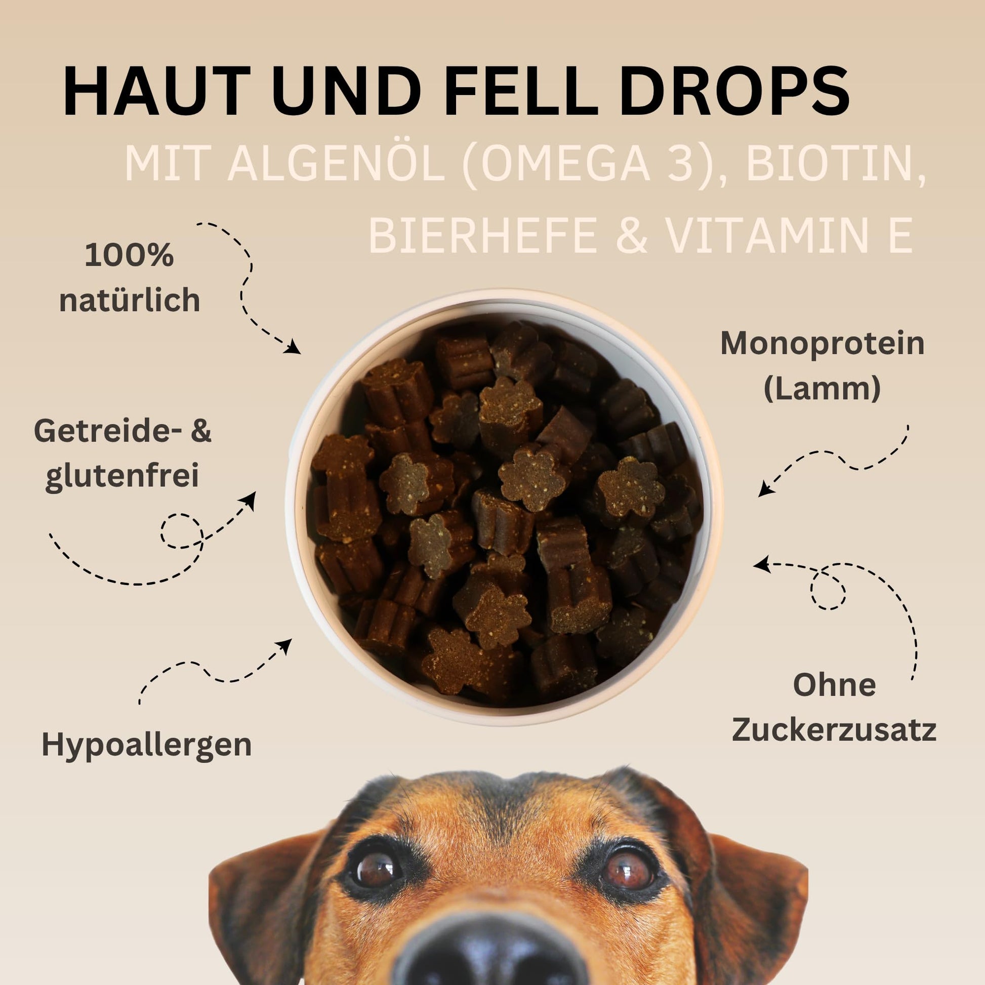 - 🐾 HAUT- UND FELLGESUNDHEIT/ ANTI JUCKREIZ: Unsere Haut und Fell Drops können Hautproblemen, Jucken, Haarausfall und Allergien entgegenwirken sowie ein glänzendes Fell durch nur natürliche Zutaten wie Biotin, Bierhefe und Omega 3 Fettsäuren unterstützen.