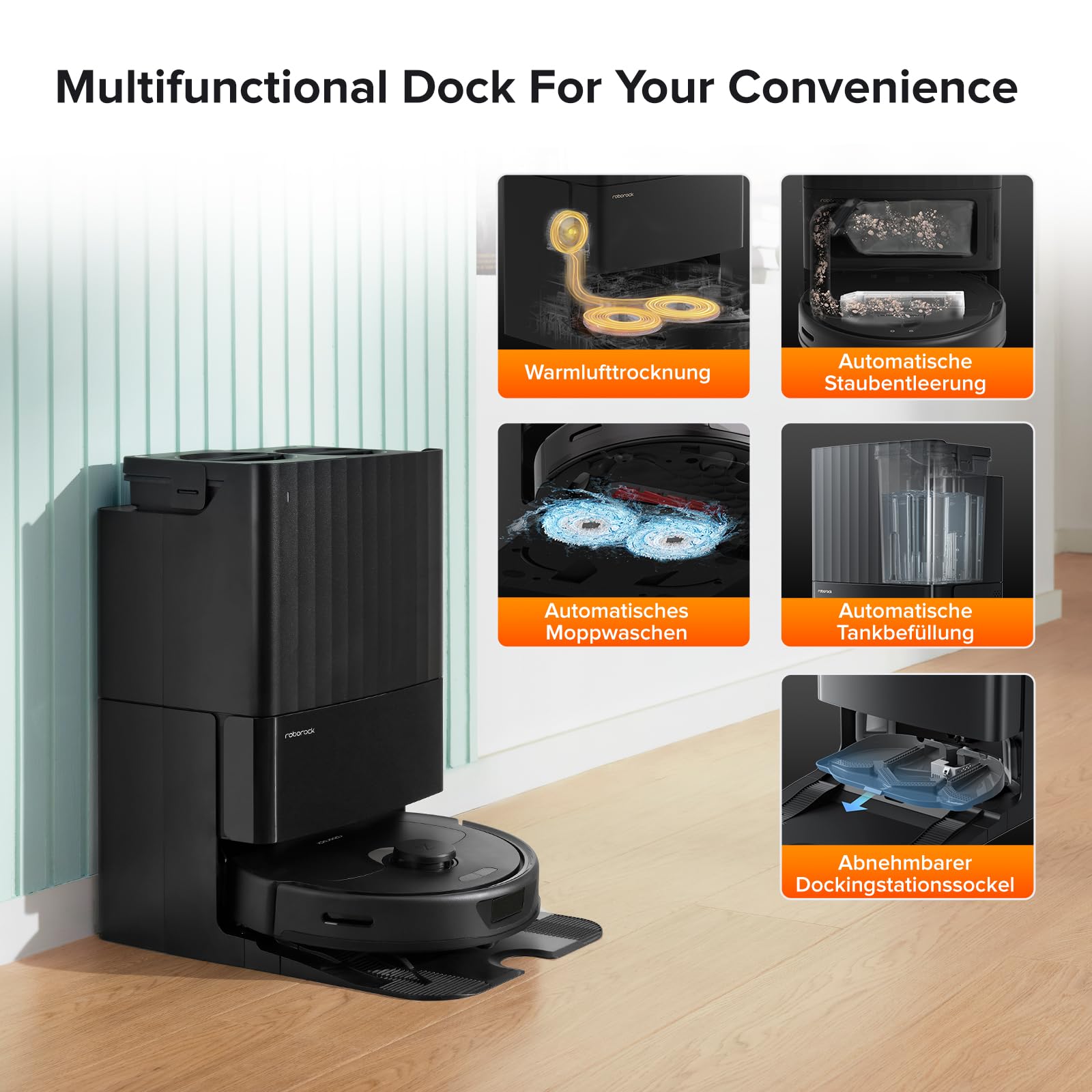 - Multi-functional dock: This uncompromising, fully automated docking station empties and washes the robot so you can focus on what's really important to you. (Self-washing/self-drying/self-draining/self-refilling/removable base).