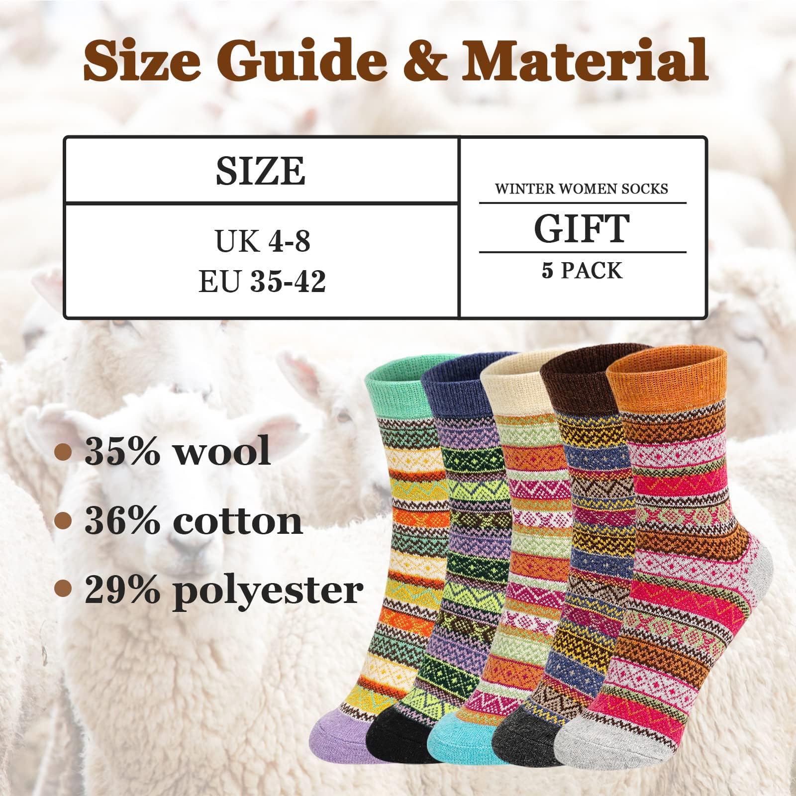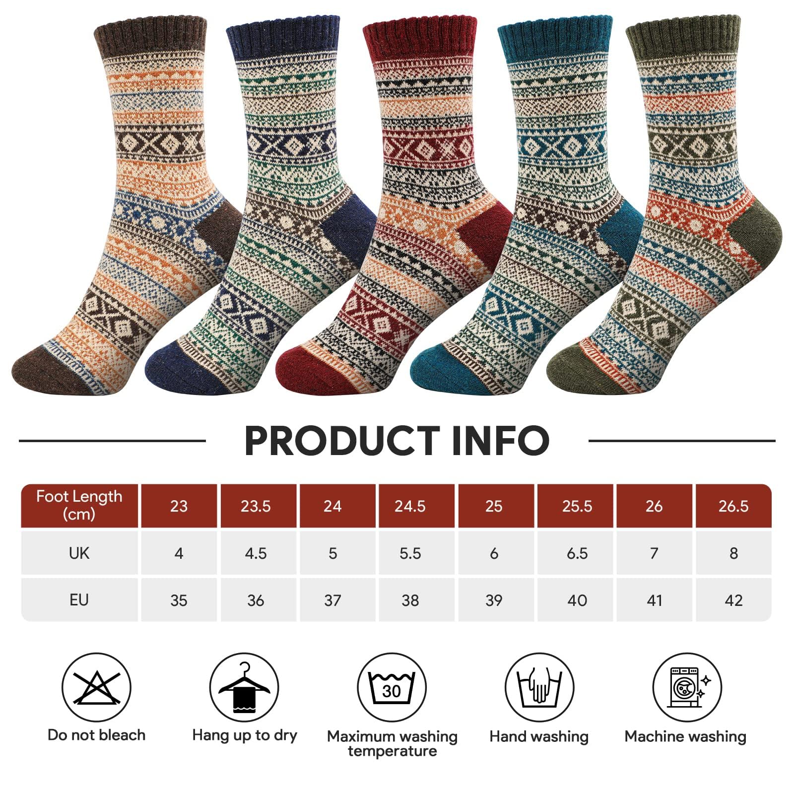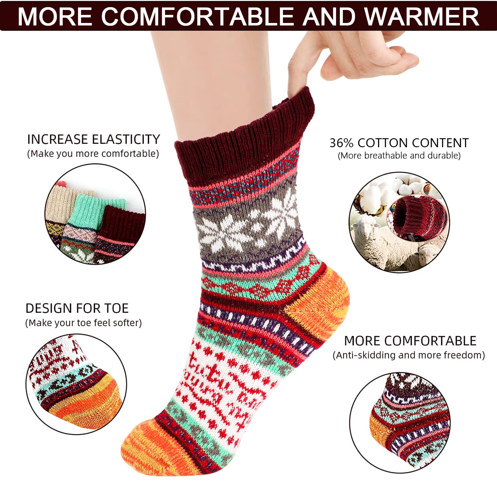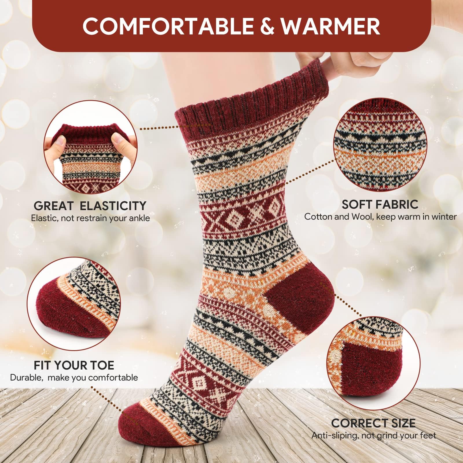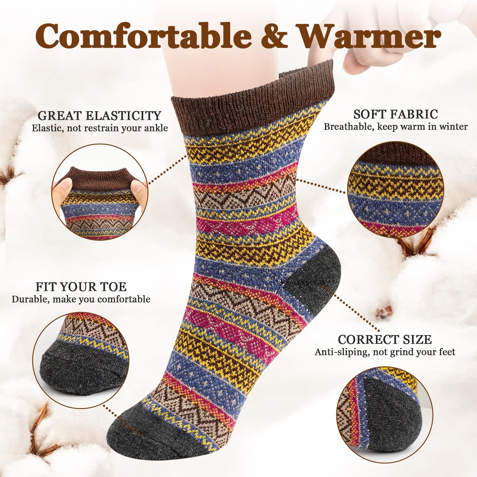 - Warm women’s winter socks with a beautiful design: 5 pairs of warm women’s winter socks in a unique and pretty design to achieve the double effect of fashion and comfort. Women's winter socks are elastic and the length is very reasonable, which can keep your feet warmer. Thermal socks in a vintage and trendy design that match everything you wear, make the cold weather beautiful and bring fun to you and your family.