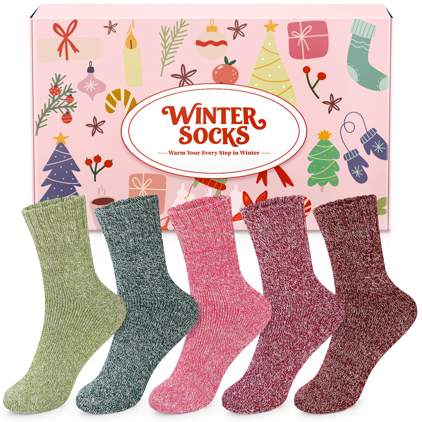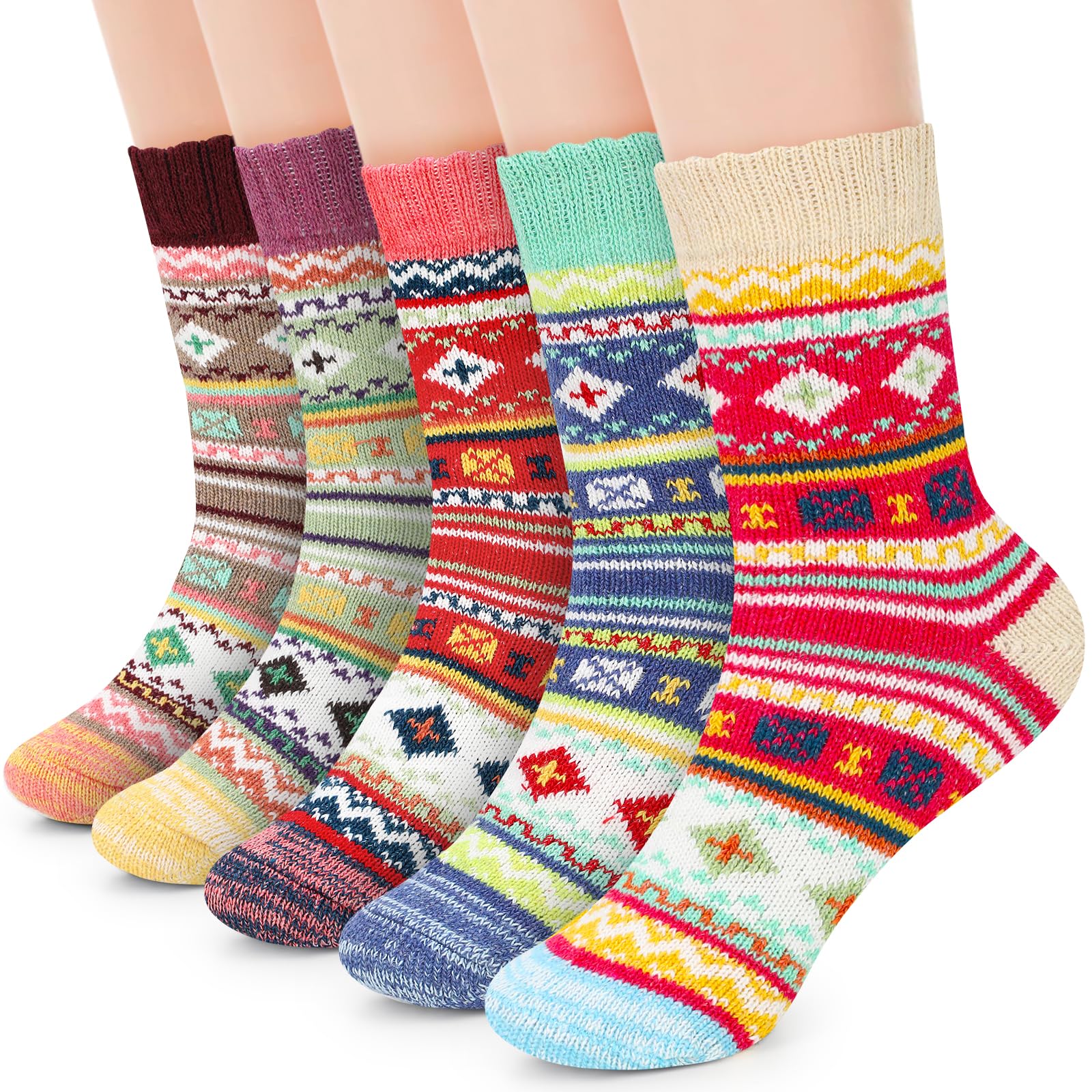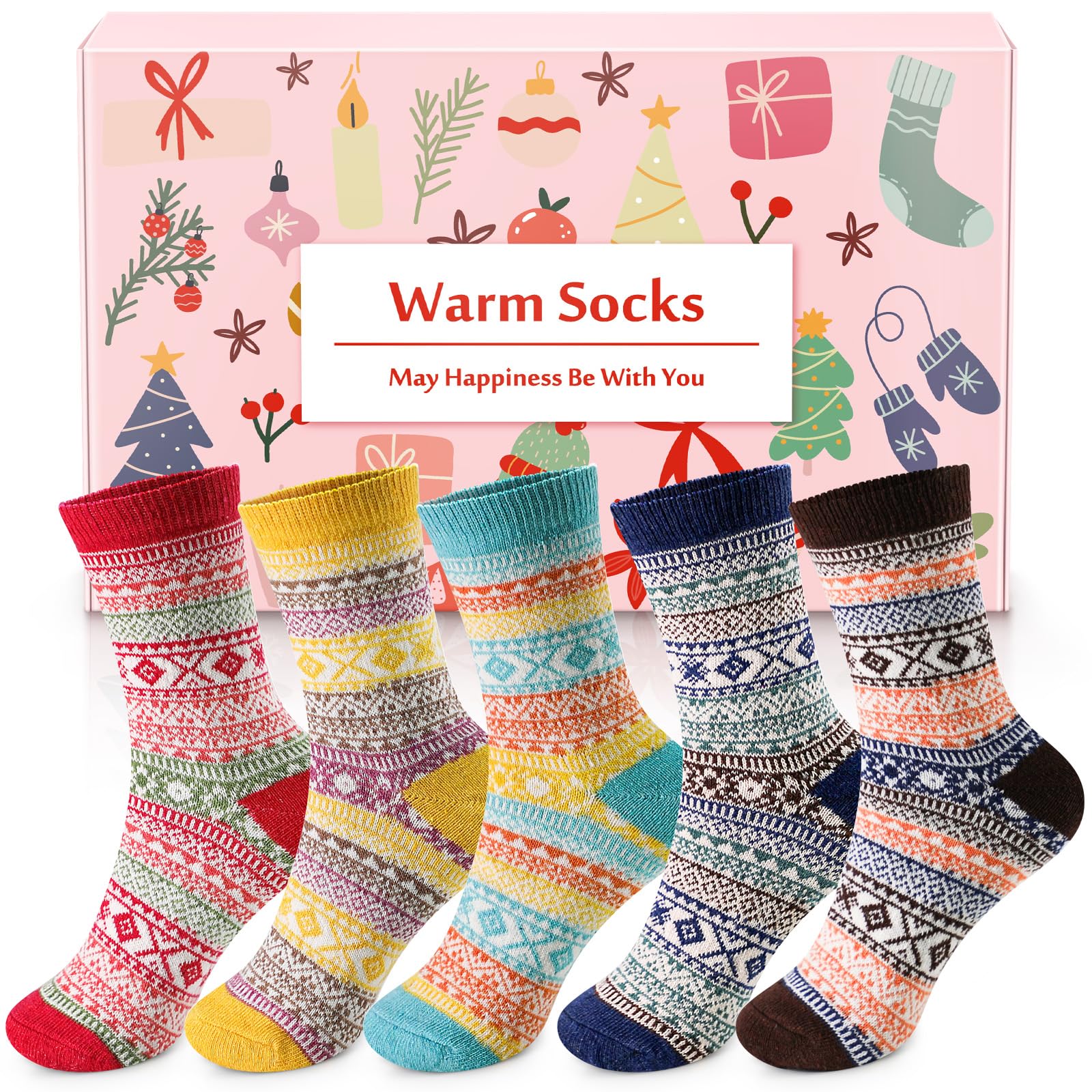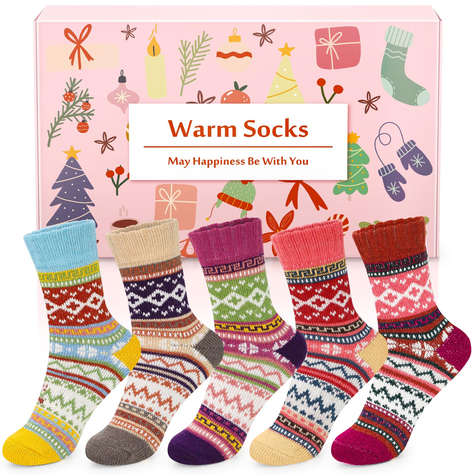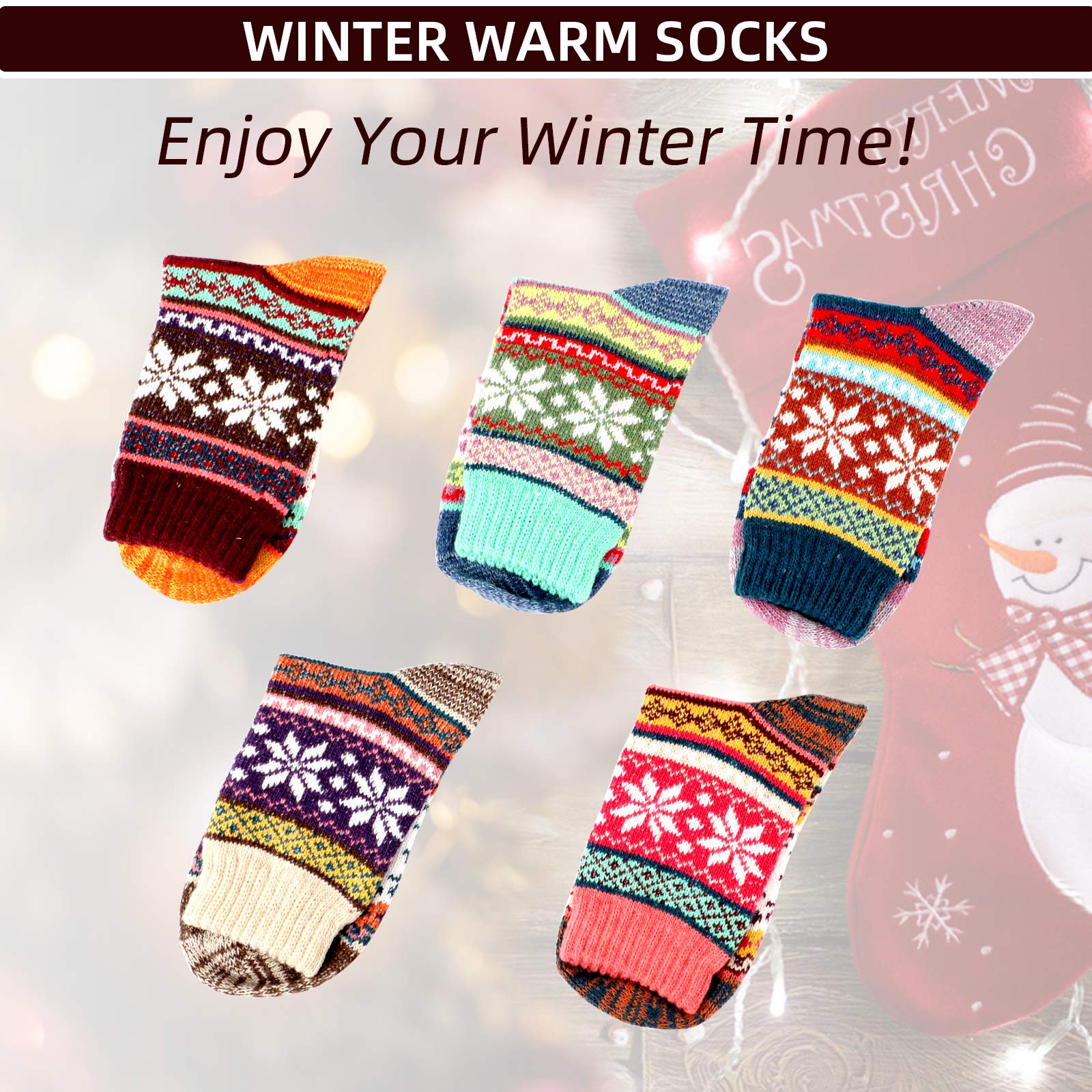 - Warm women’s winter socks with a beautiful design: 5 pairs of warm women’s winter socks in a unique and pretty design to achieve the double effect of fashion and comfort. Women's winter socks are elastic and the length is very reasonable, which can keep your feet warmer. Thermal socks in a vintage and trendy design that match everything you wear, make the cold weather beautiful and bring fun to you and your family.