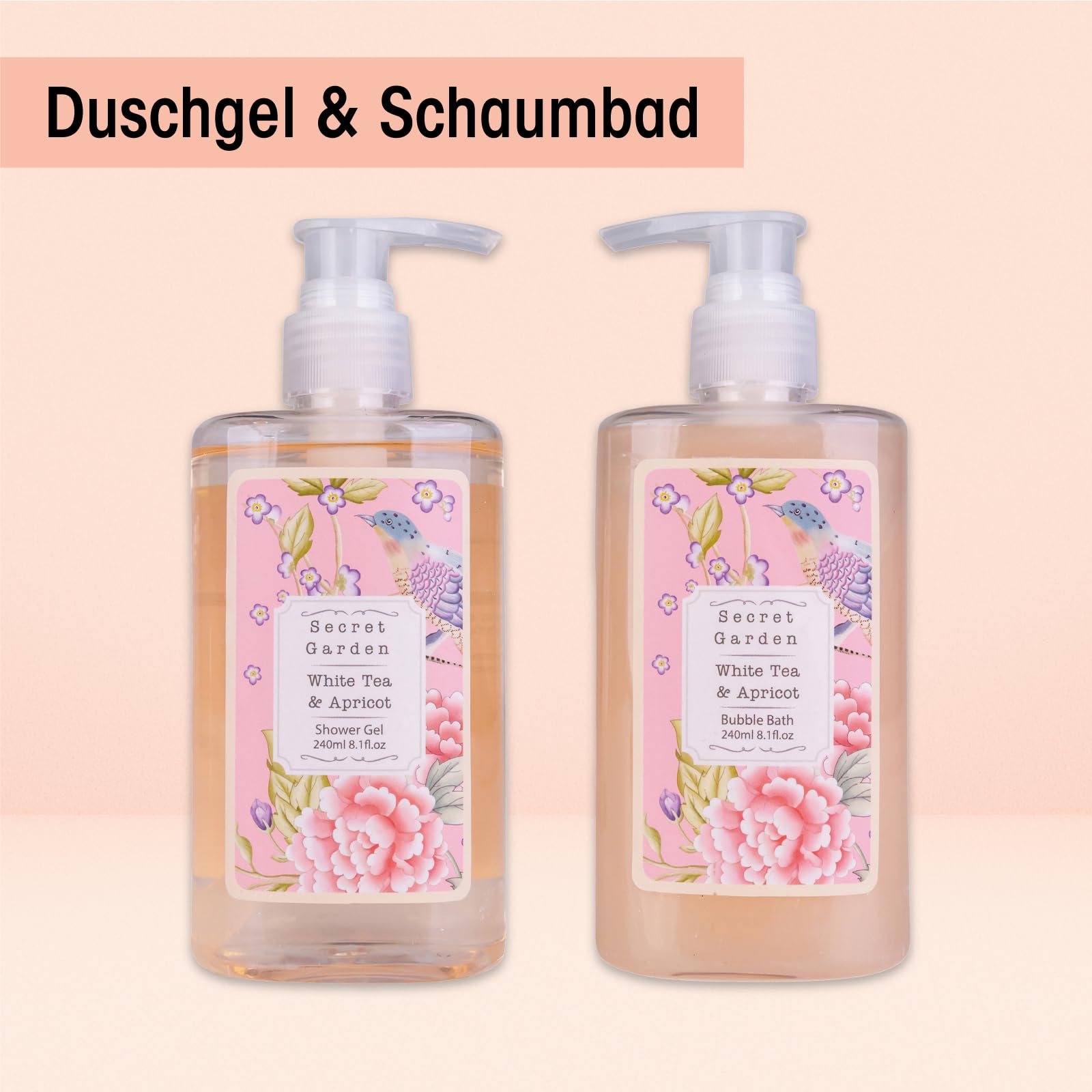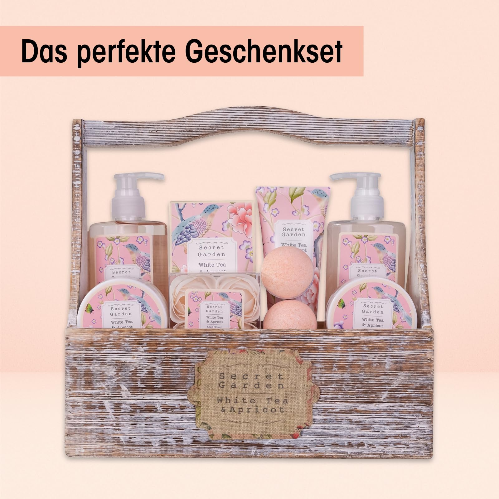 - VERWÖHNSET: Die nach White Tea & Apricot duftenden Pflegeprodukte verwöhnen die Haut, sodass sie zart und geschmeidig wird. Alle Produkte kommen bereits in einem stilvollen Geschenkkorb im Shabby-Look, der sich perfekt zur Aufbewahrung und Dekoration eignet
