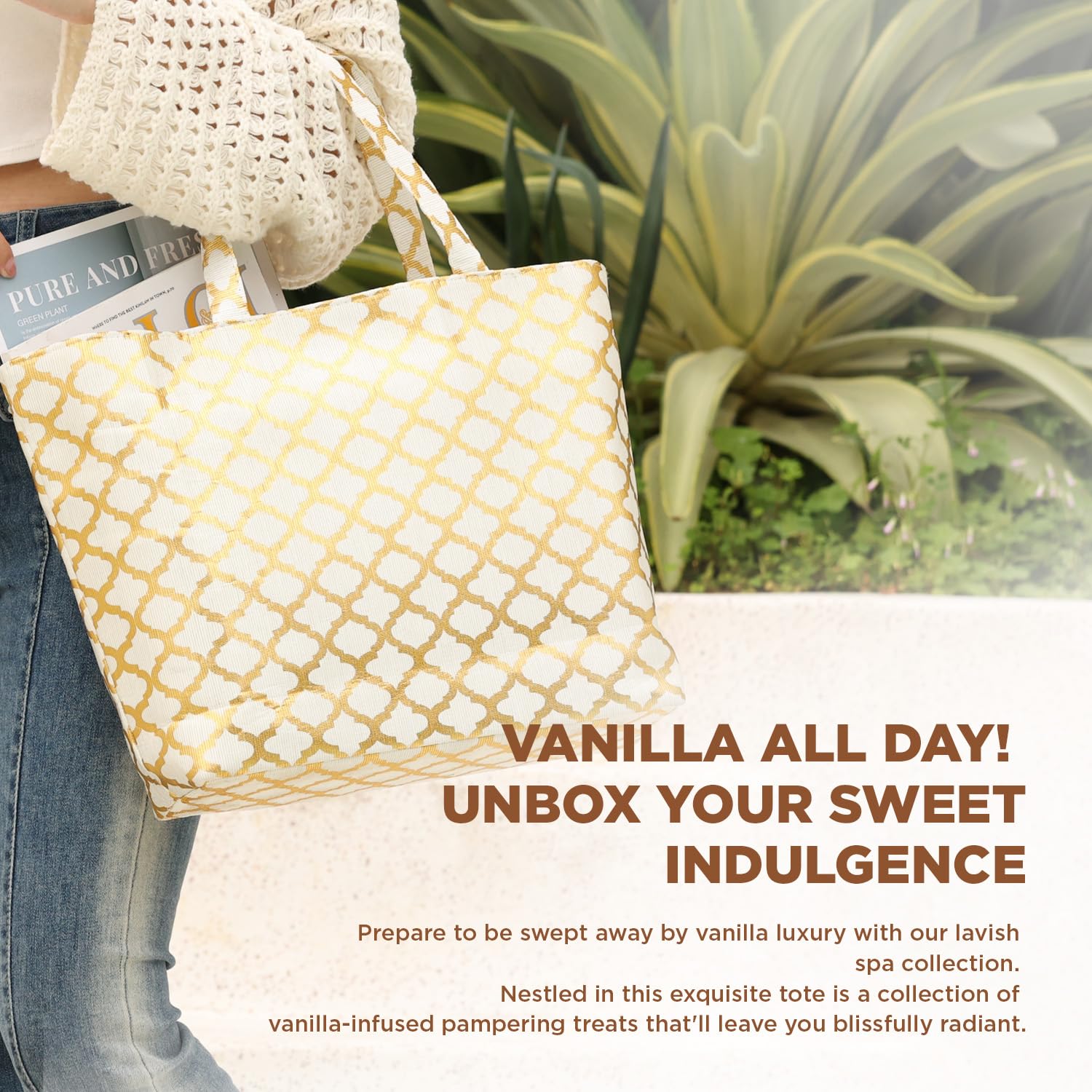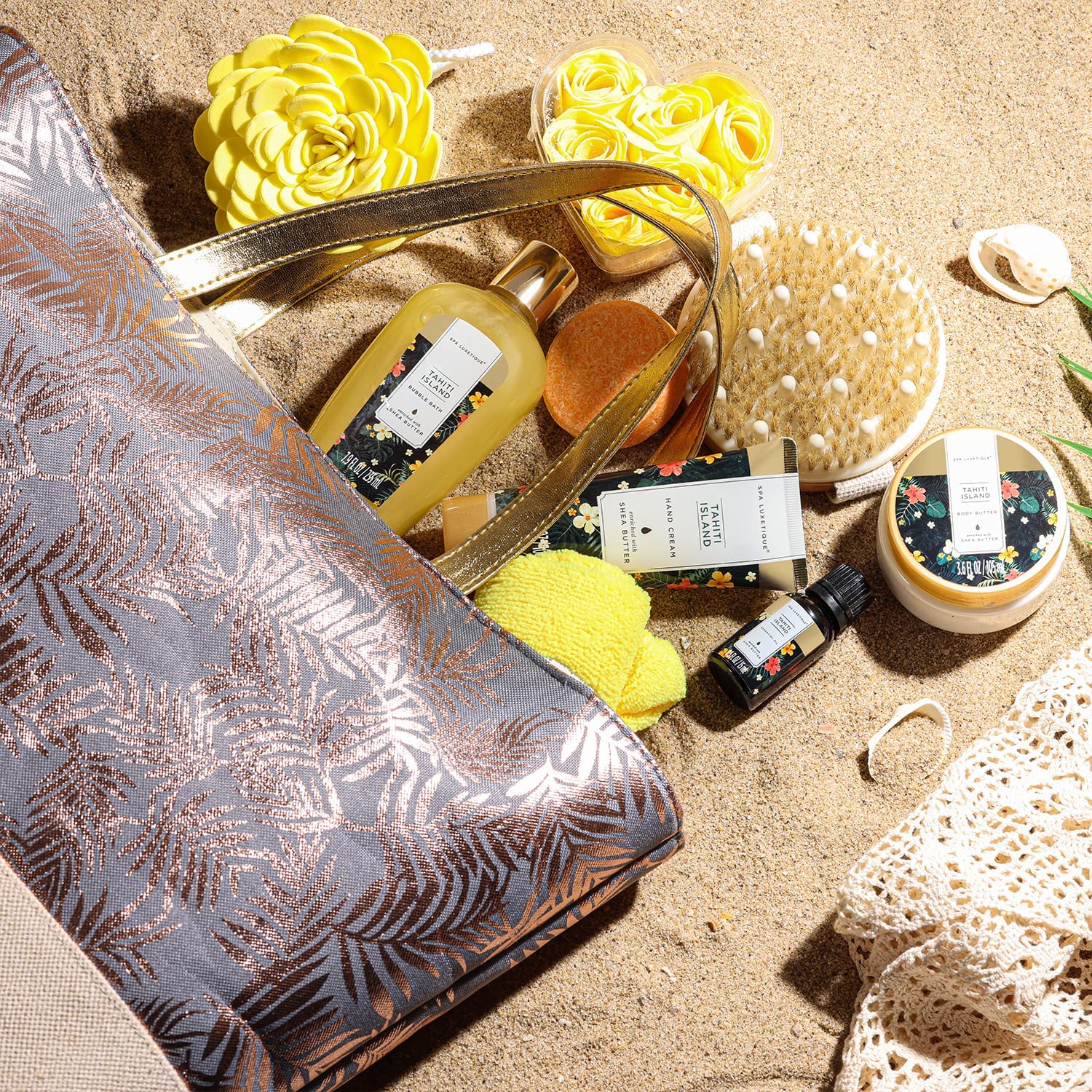 - The spa set contains 100 ml hand cream, 235 ml shower gel, 235 ml bubble bath, 105 ml body lotion, 105 ml body butter, 50 g shampoo soap, 15 ml essential oil, 200 g bath salt, two bath bombs of 115 g, 6 petals, a hair turban with button, a soft bath sponge, bath brush and a spacious handbag