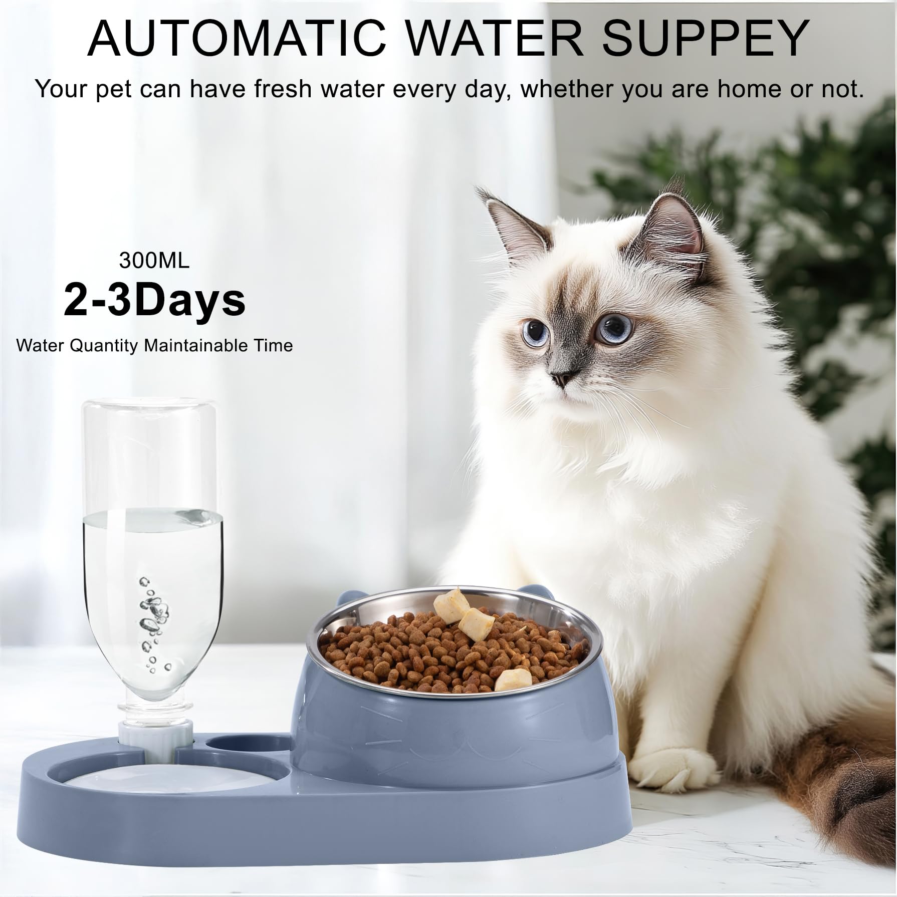 Cat Feeding Station with Automatic Water Bottle, 2-in-1 Raised Bowl Made of Stainless Steel