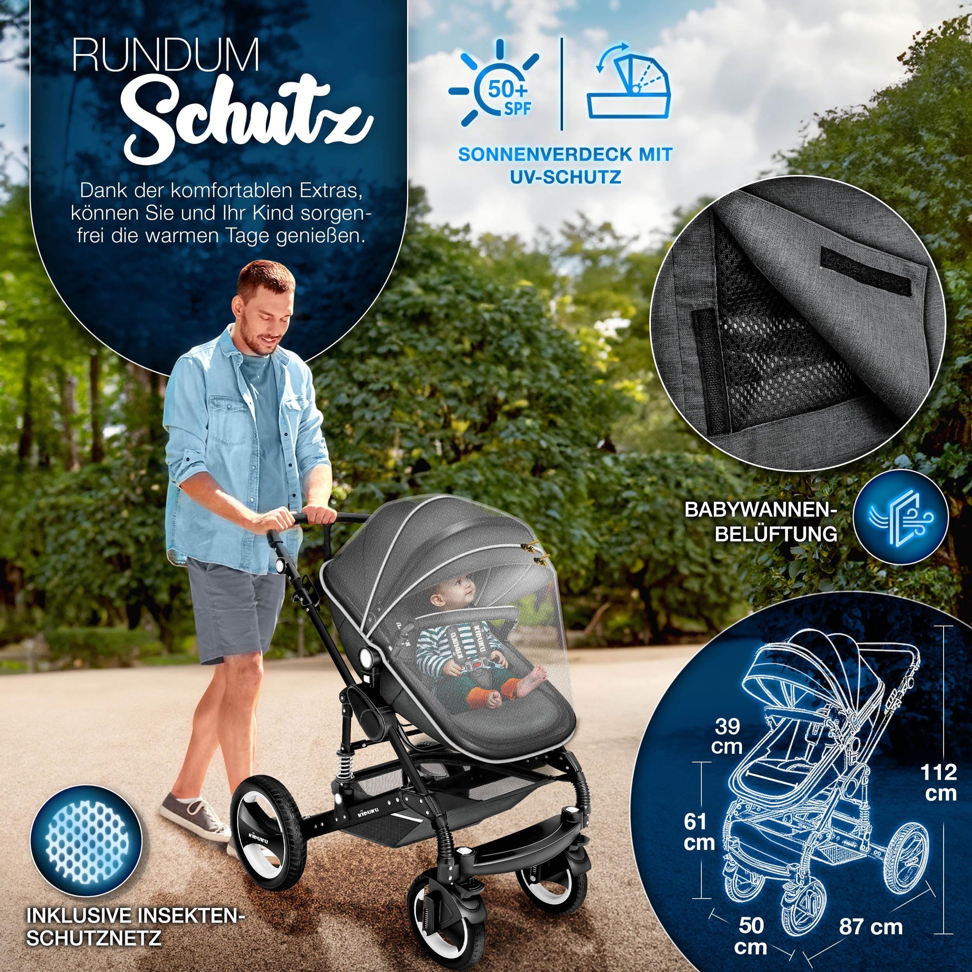 3-in-1 pushchair / carrycot, sports seat (buggy) and baby seat. Solid rubber tyres. Direction of travel can be selected on both sides. Very stable aluminium frame. For children up to 3 years or max. 15 kg, 5-point safety belt, 4-way adjustable sun canopy with UV 50+ protection, removable safety bar, parking brake for secure hold, foldable baby cot, 360° rotating tyres, removable transport basket for storing shopping, removable protective blanket (ideal for summer and winter), side drink holder, back organiser with multiple compartments, 4-fold and also double-sided suspension for maximum comfort, padded and adjustable backrest. space-saving folding