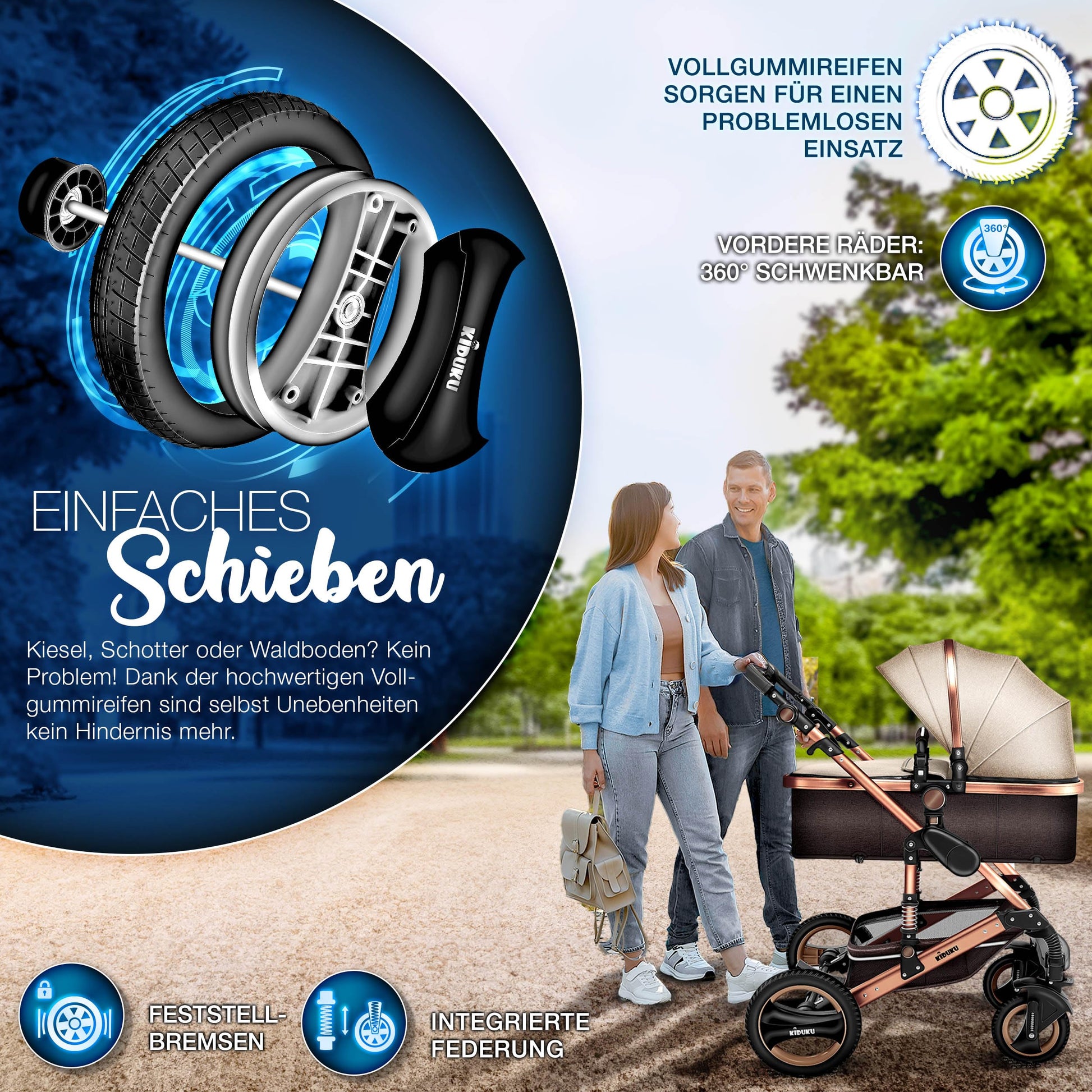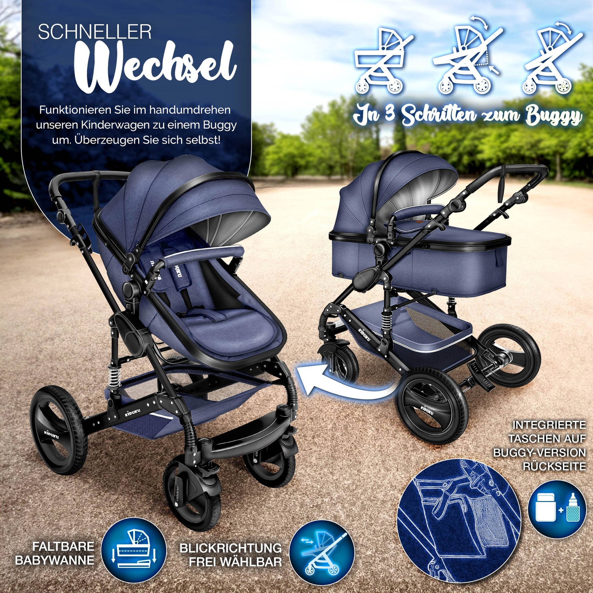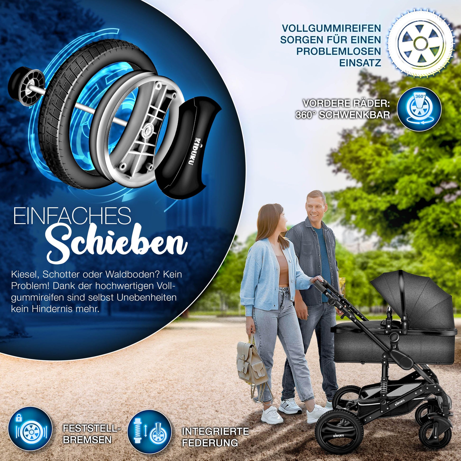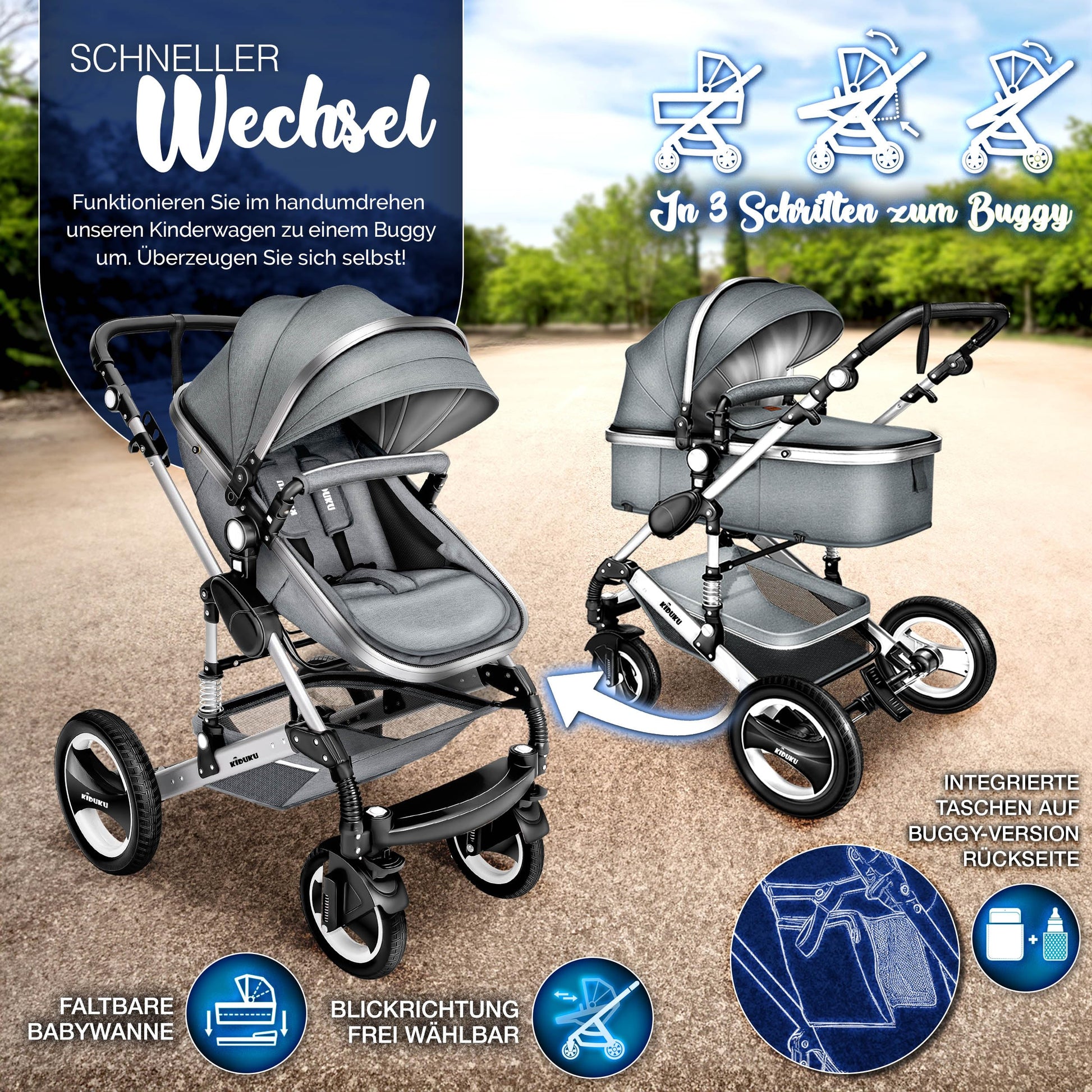 KIDUKU 3-in-1 Pushchair Set | Combination Pram incl. Baby bath, buggy, car seat, footmuff, full rubber tyres, changing bag, rain cover, children's table
