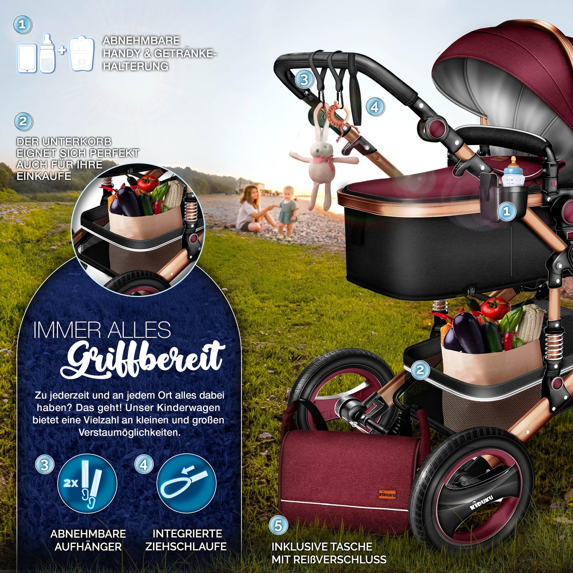 - 3-in-1 pram set: The Kiduku pram is a multifunctional companion for children from birth to a weight of 22 kg. The included complete set allows for ideal mobility. The combination pram can be used with both bucket seat and carry cot. The aluminium frame is very stable and also very light.
