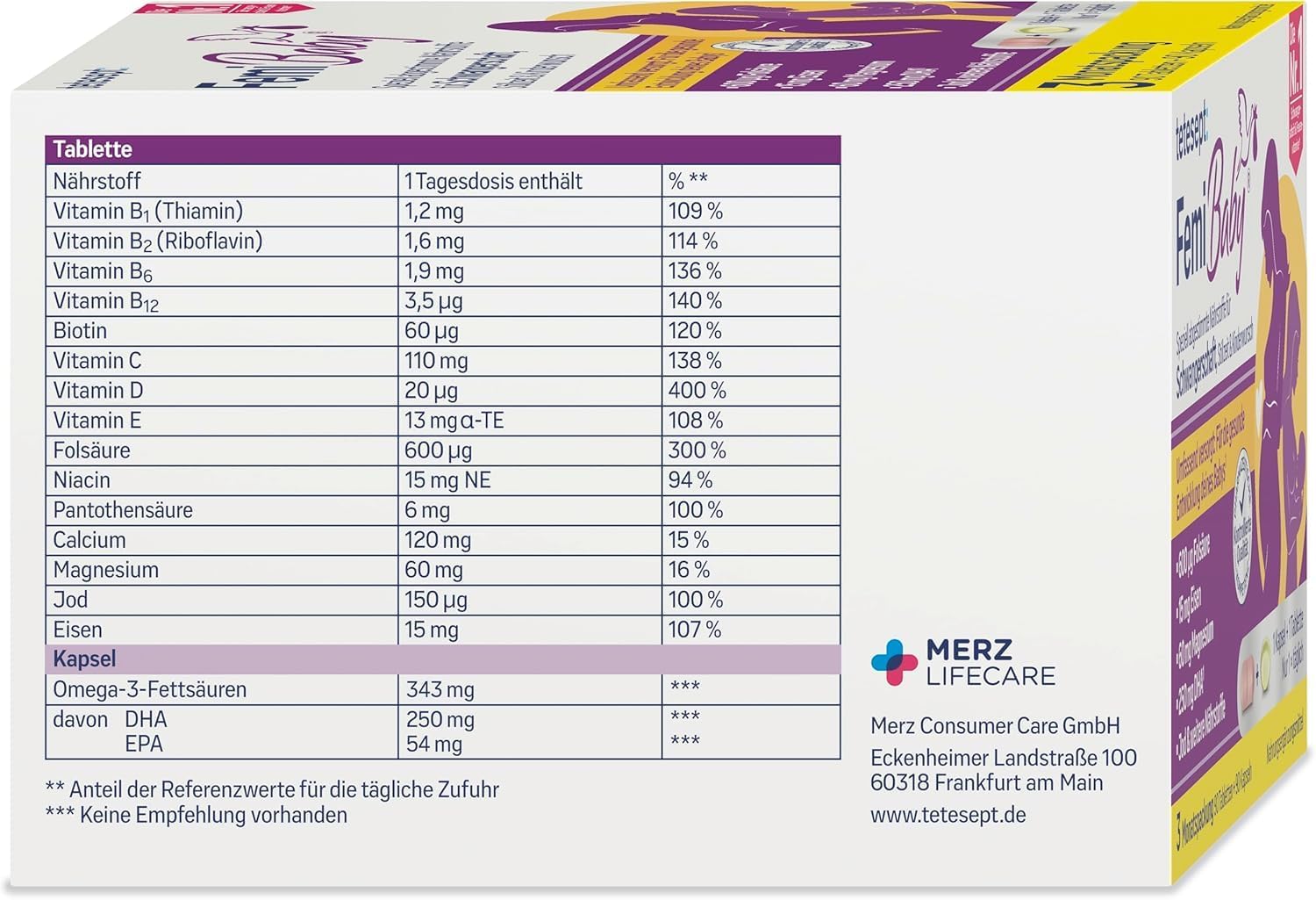 - Box contents: 1 x tetesept Femi Baby (3 month pack of 90 tablets + 90 capsules), with minerals, vitamins and omega-3 fatty acids for a comprehensive supply of nutrients with increased nutrient requirements.