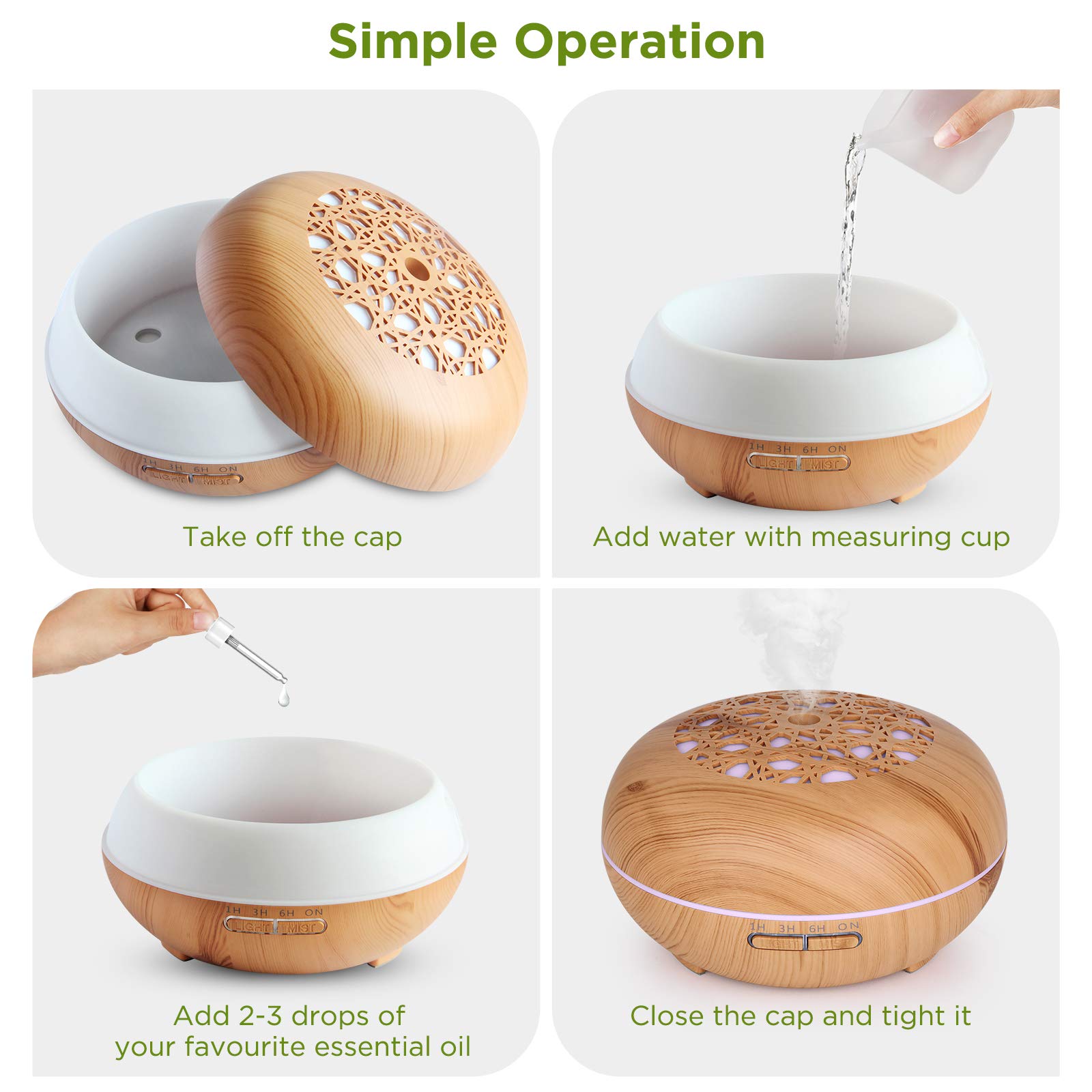 - Einfach zu verwenden: Sie können die Tasten Fernbedienung und Aromadiffusor verwenden, um das Timing zu erreichen(1 Stunde / 3 Stunden / 6 Stunden / EIN), das Licht anzupassen (7 LED-Lichter) und die Größe des Nebels zu steuern.